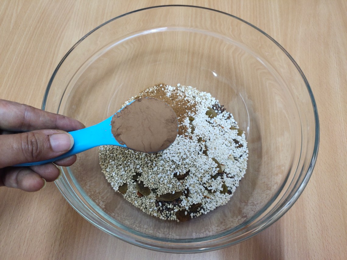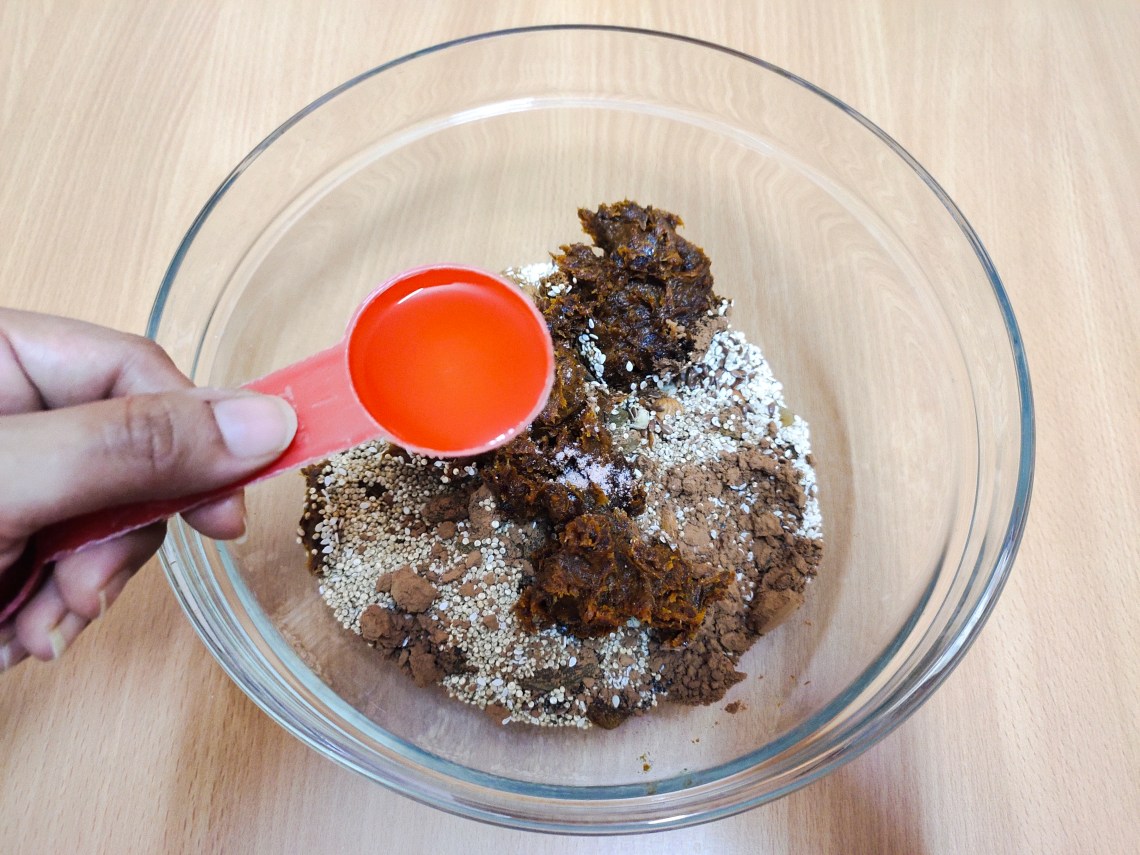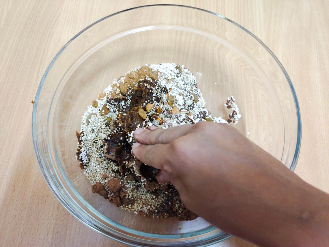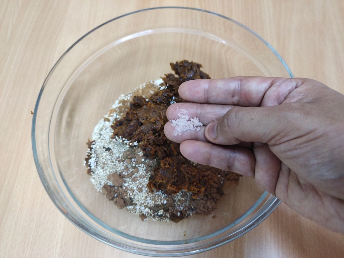 In a bowl add dates paste, oil and the ground powder, raisins, cinnamon, cocoa powder mix them with your hands.