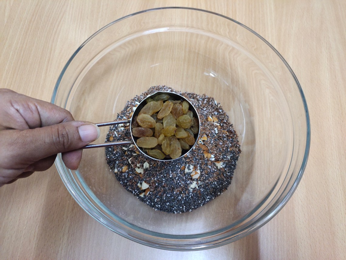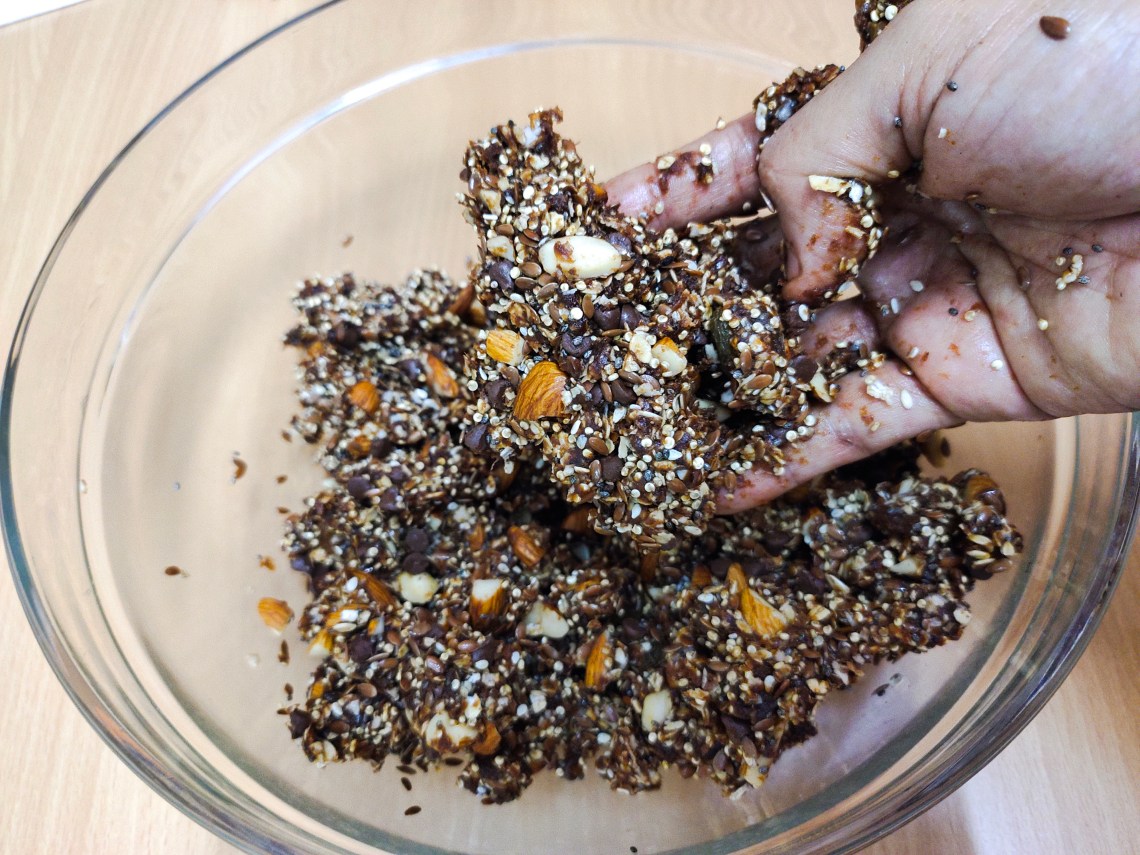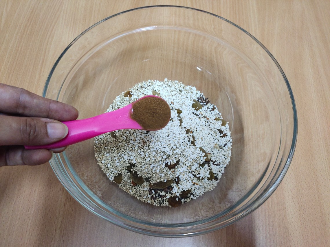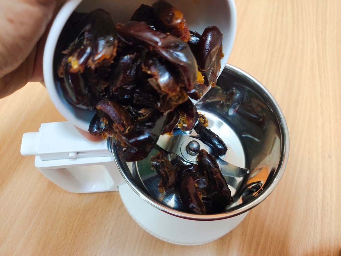 In a bowl add dates paste, oil and the ground powder, raisins, cinnamon, cocoa powder mix them with your hands.