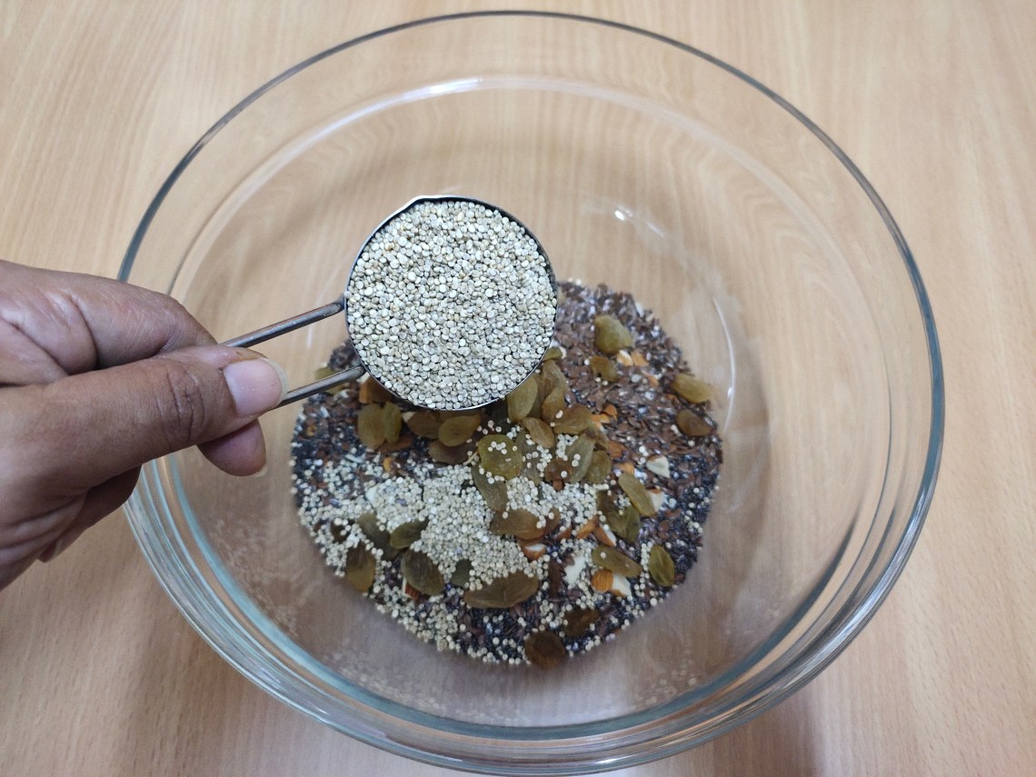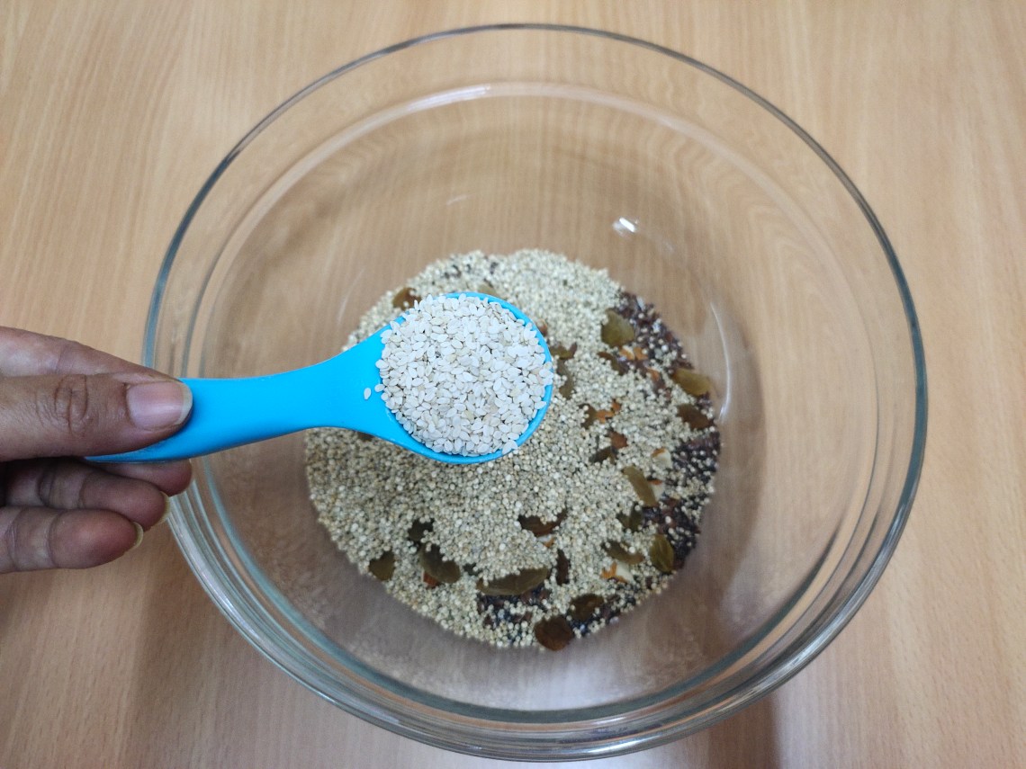 Feel free to use nut butter, honey, vanilla extract, any dried fruit and nuts of your choice. I have used only dates for sweetness. This bar is good for hair growth and over all health as it involves coconut oil and seeds.