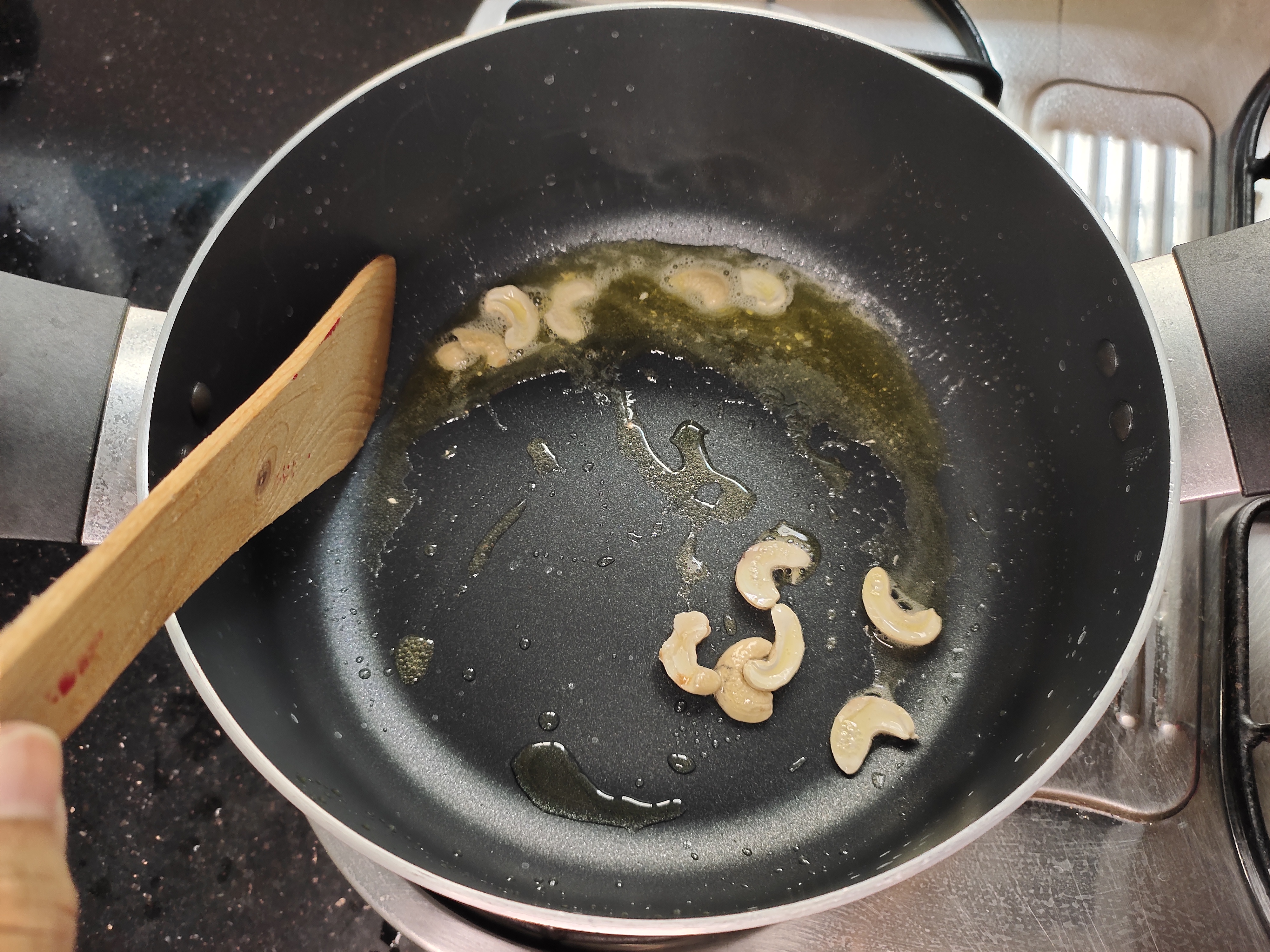 In a pan heat ghee and add broken cashews.
