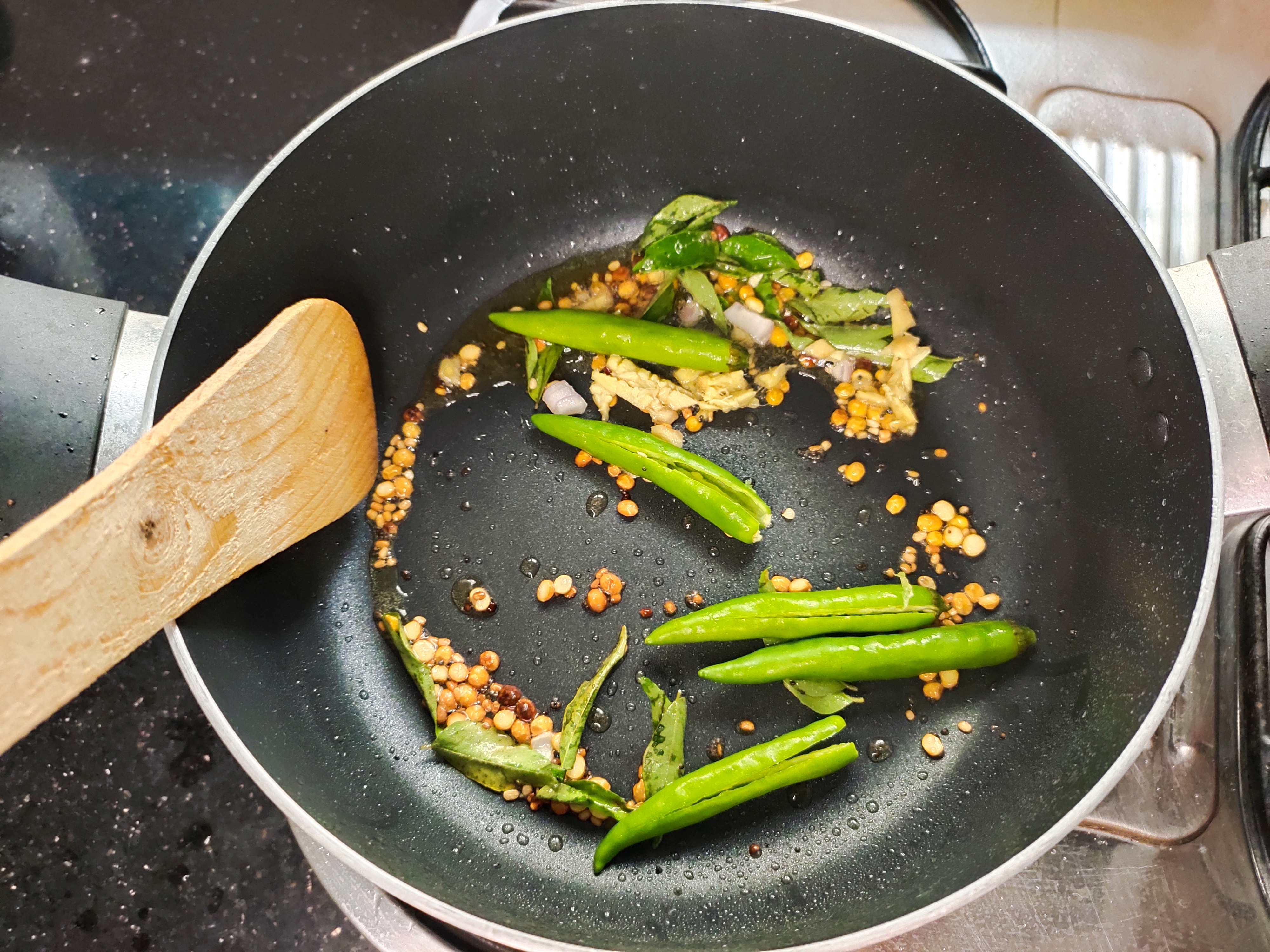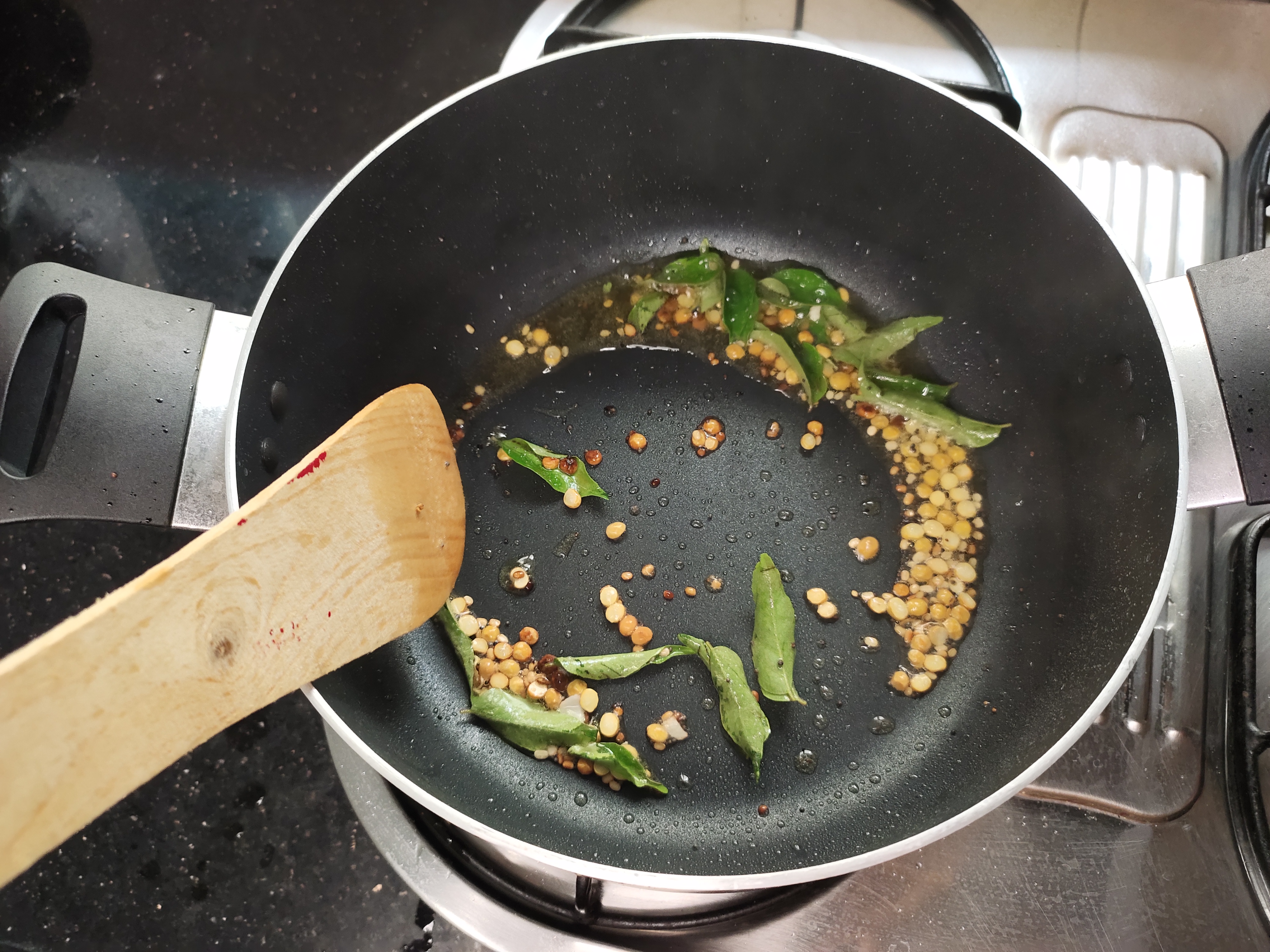 In the same pan temper mustard seeds, channa dal, urad dal and curry leaves.