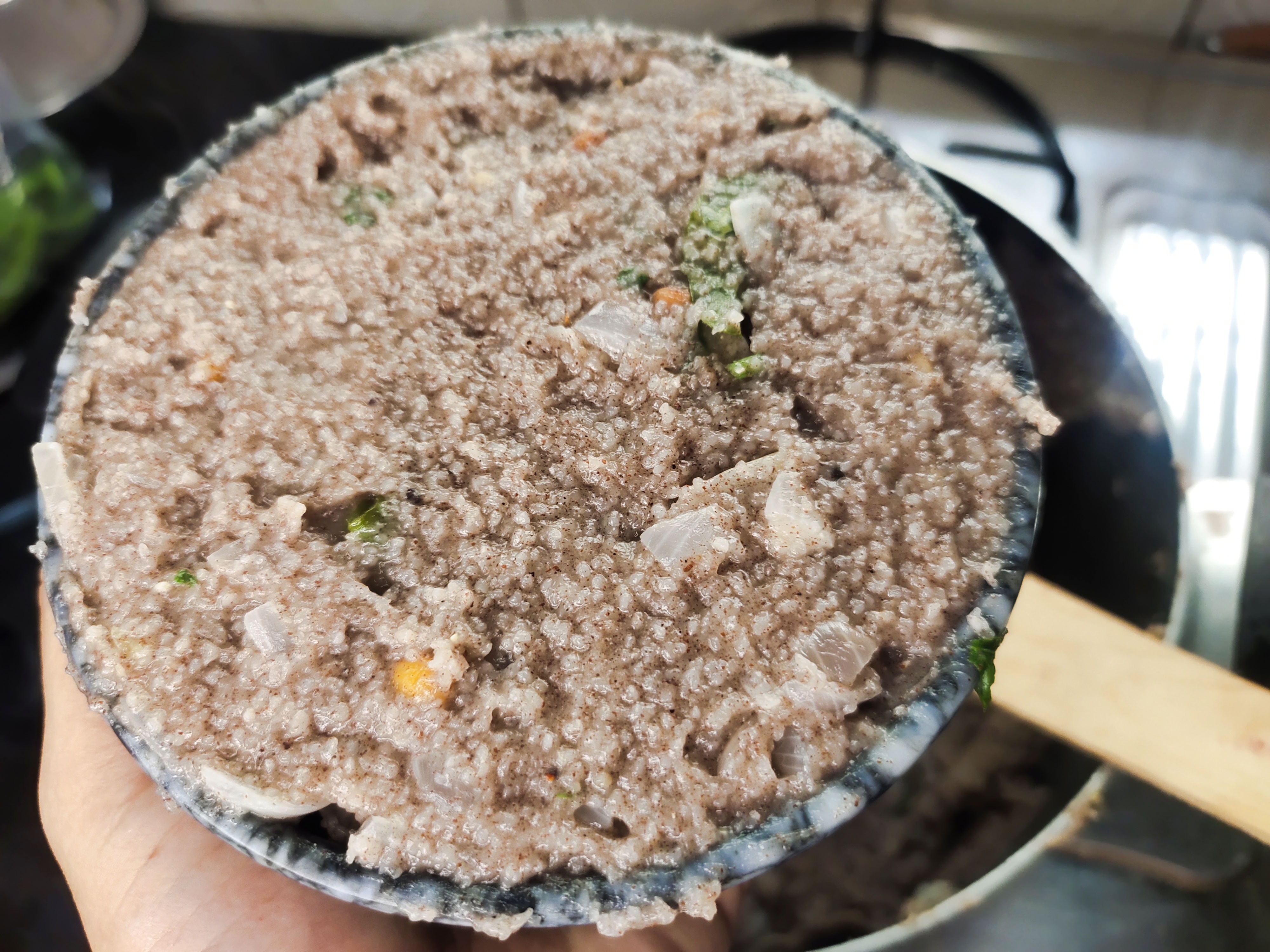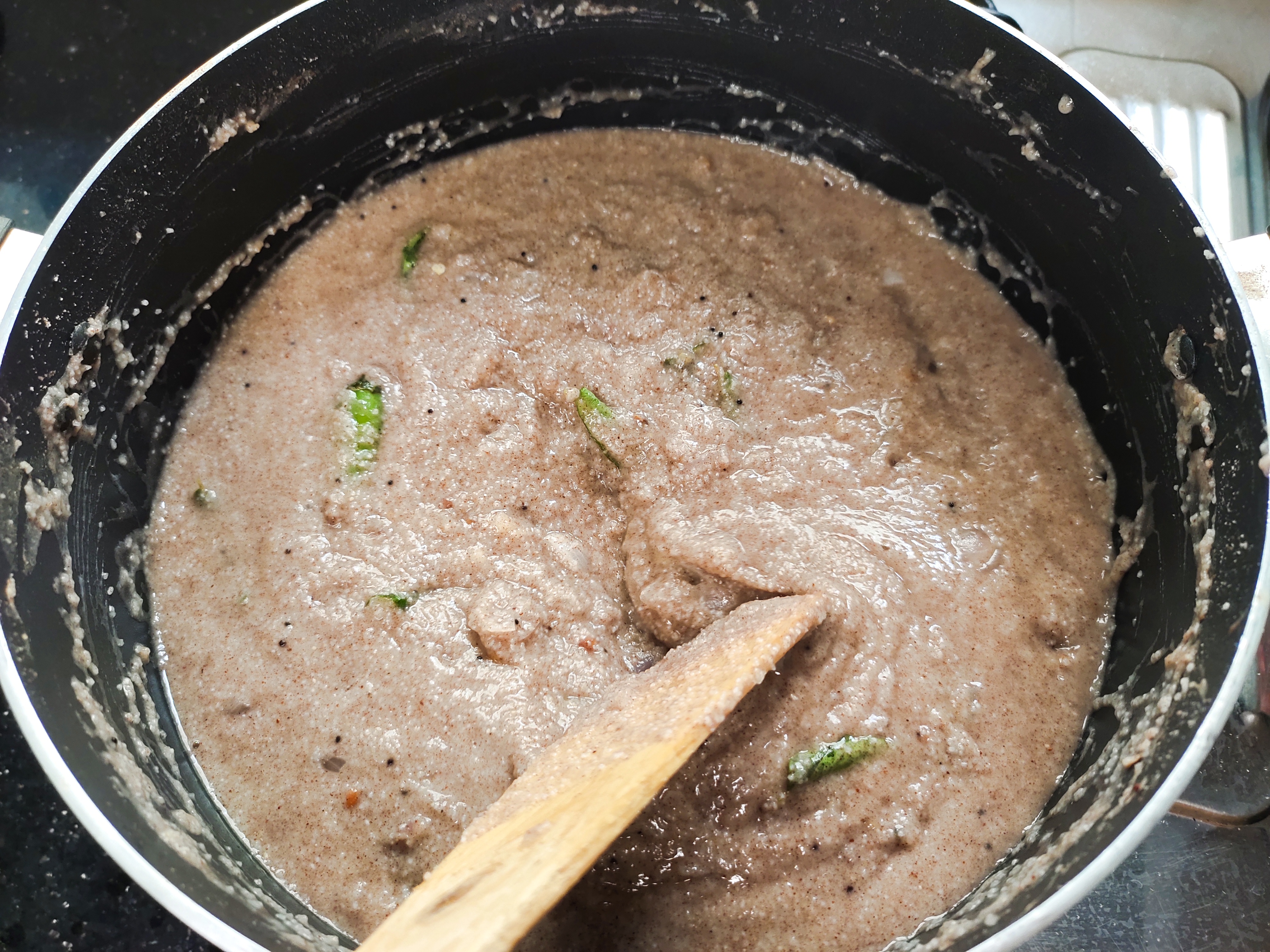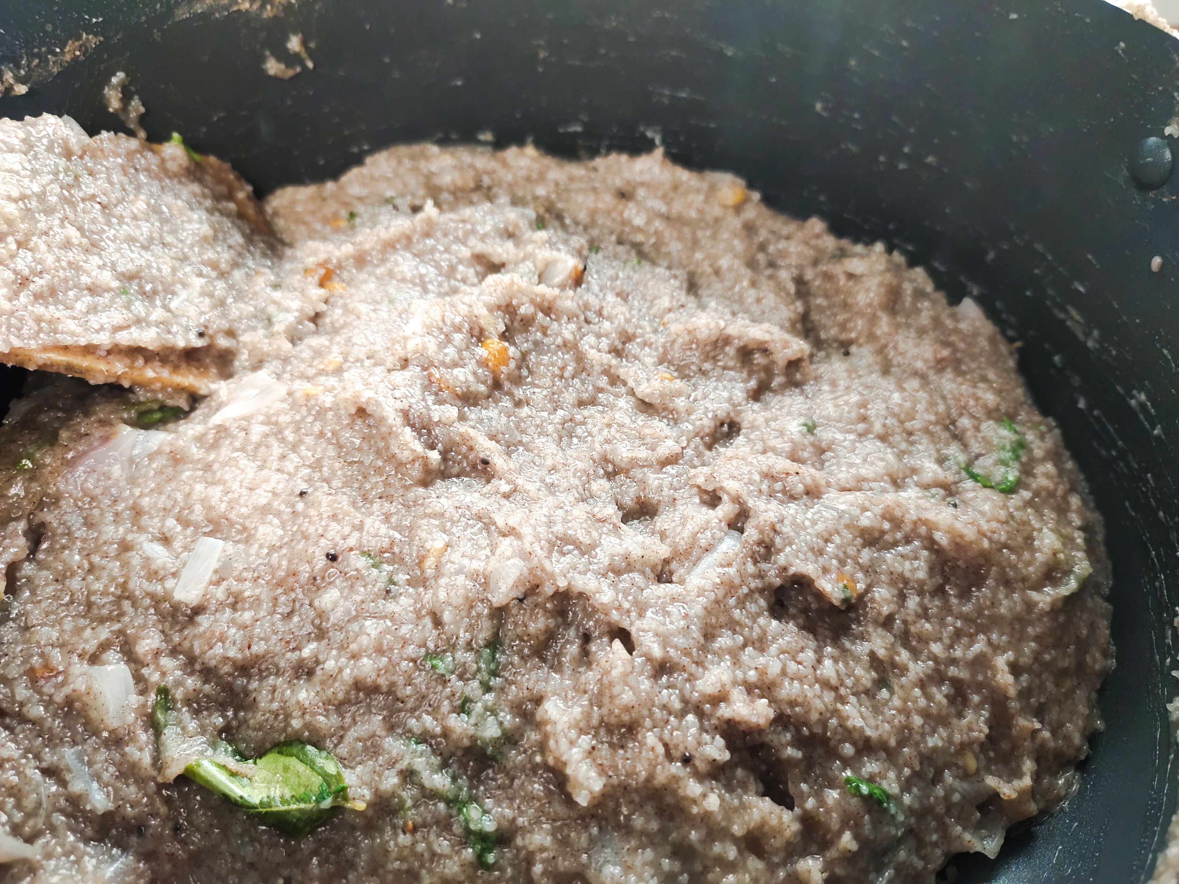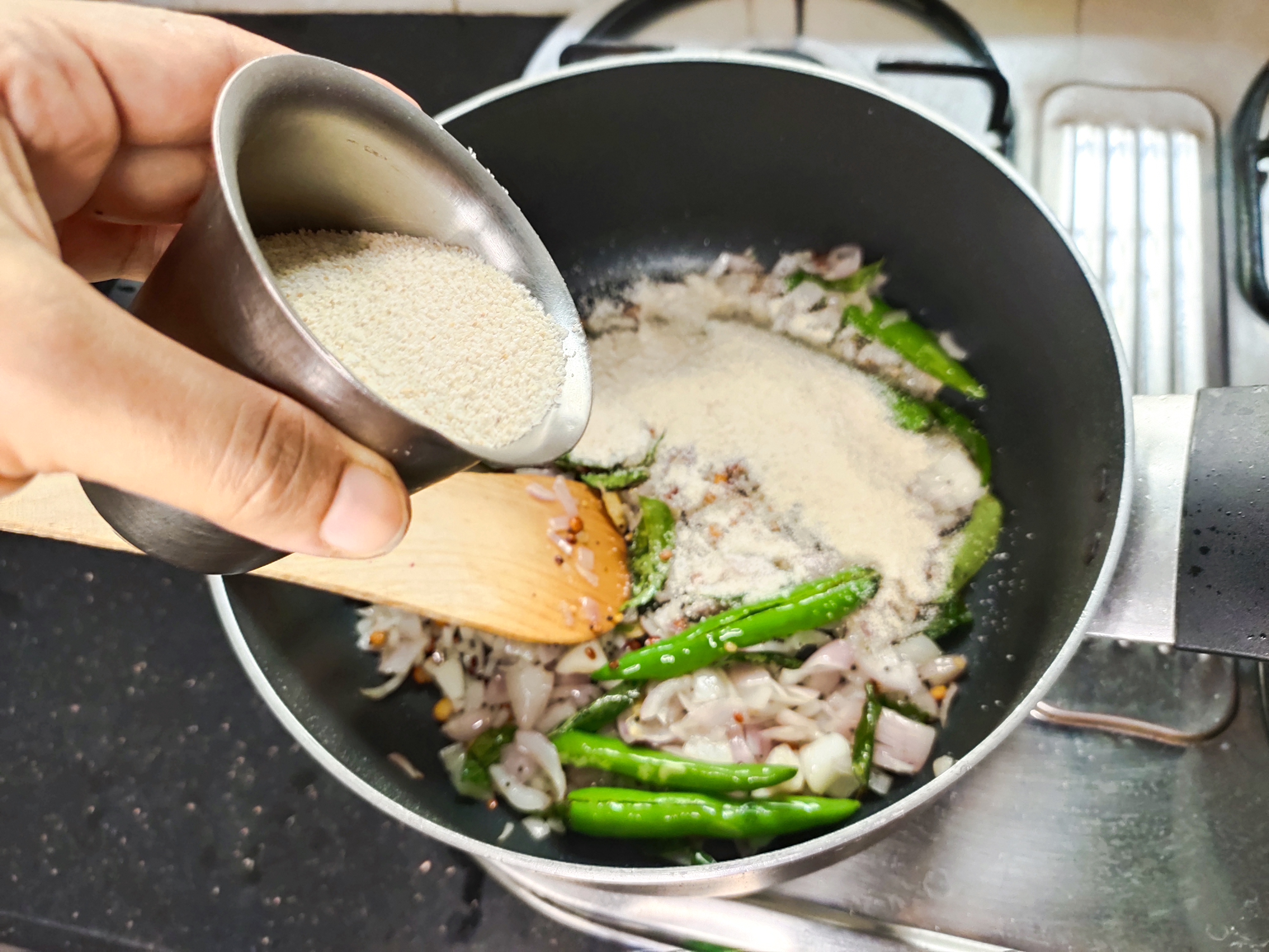 When the onions are transparent, add 1 cup rava, 1 cup ragi and roast well till aromatic.