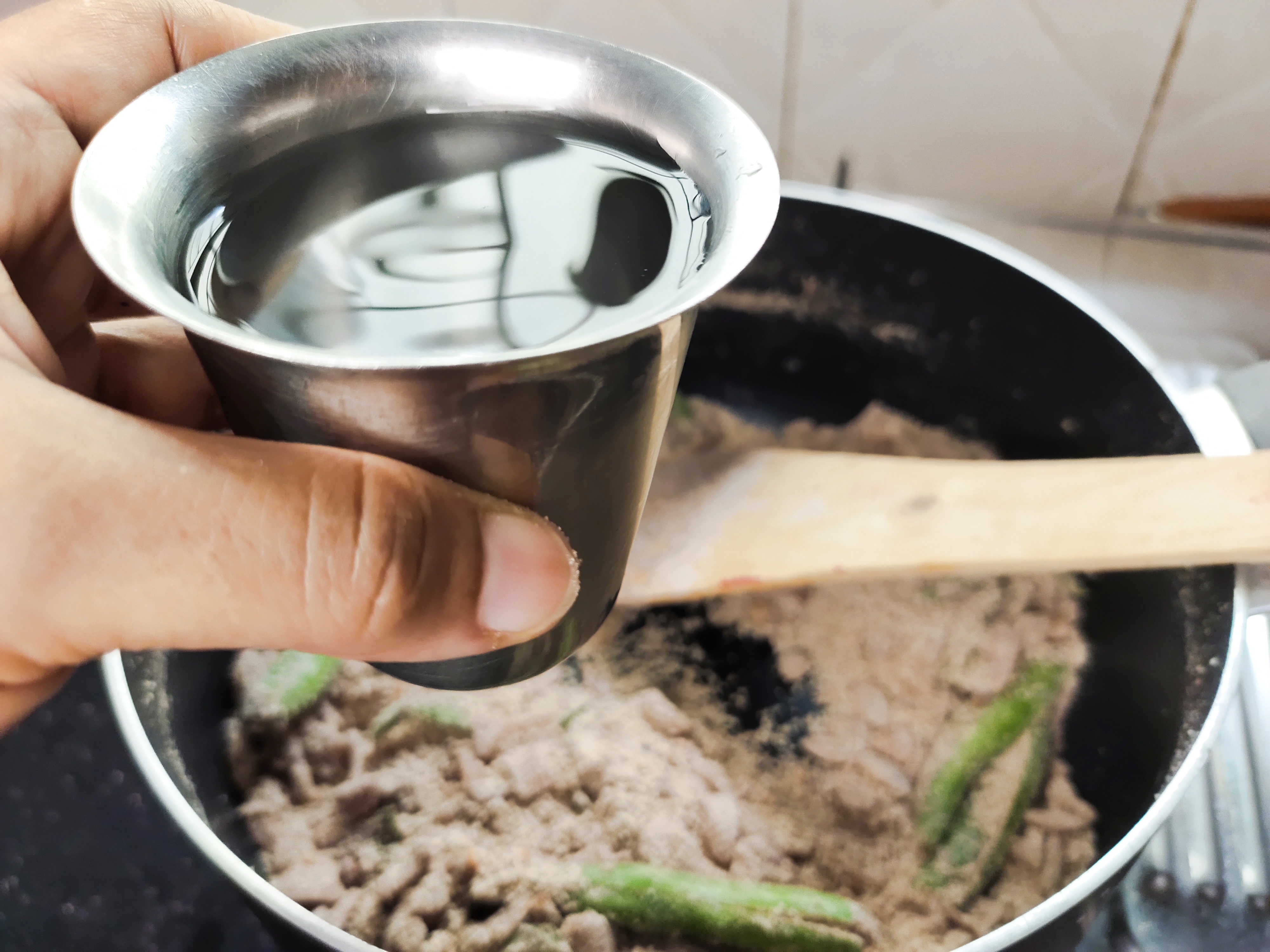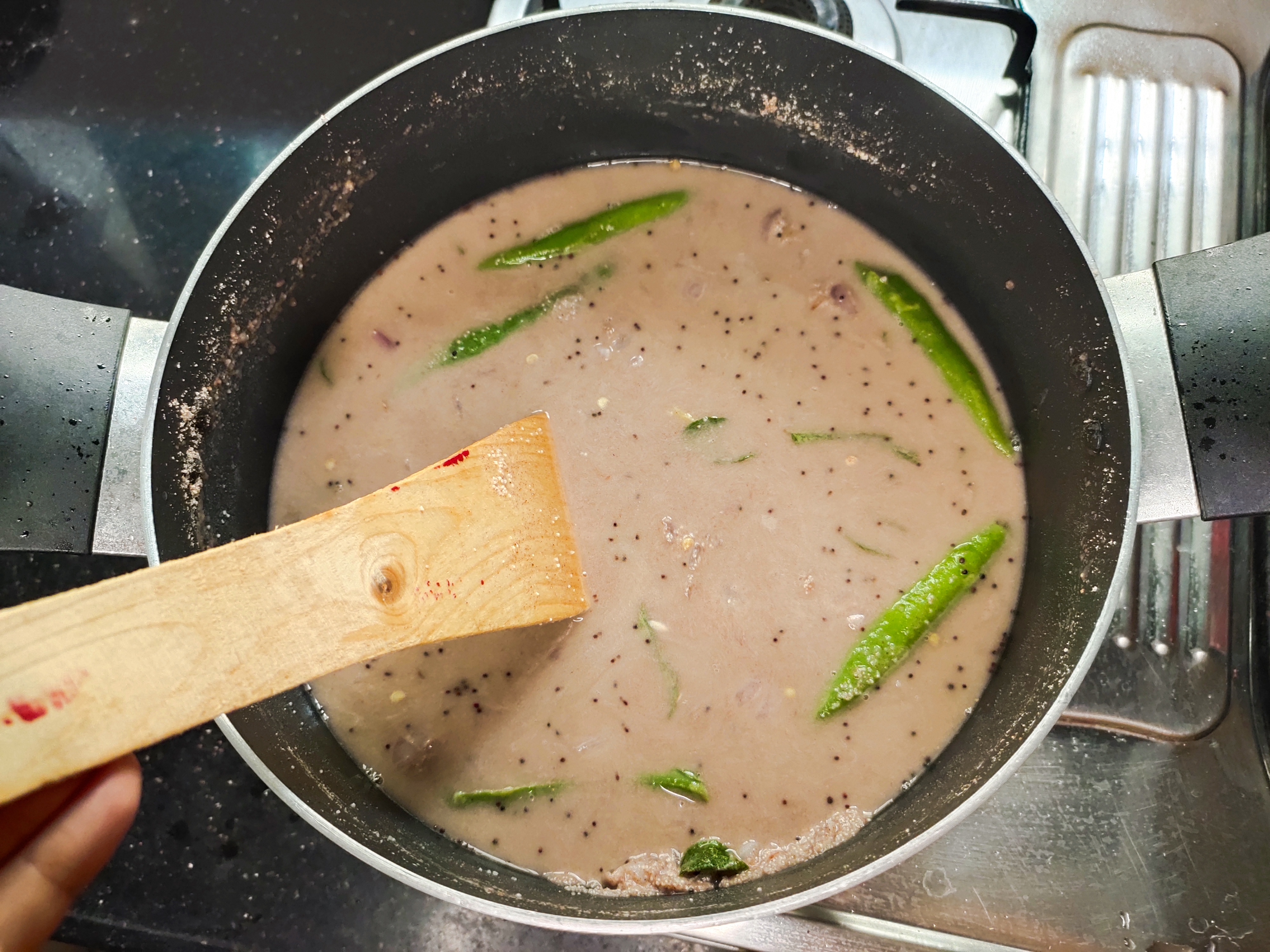 Add 6 cups water (use same cup)to the pan and stir well without any lumps.