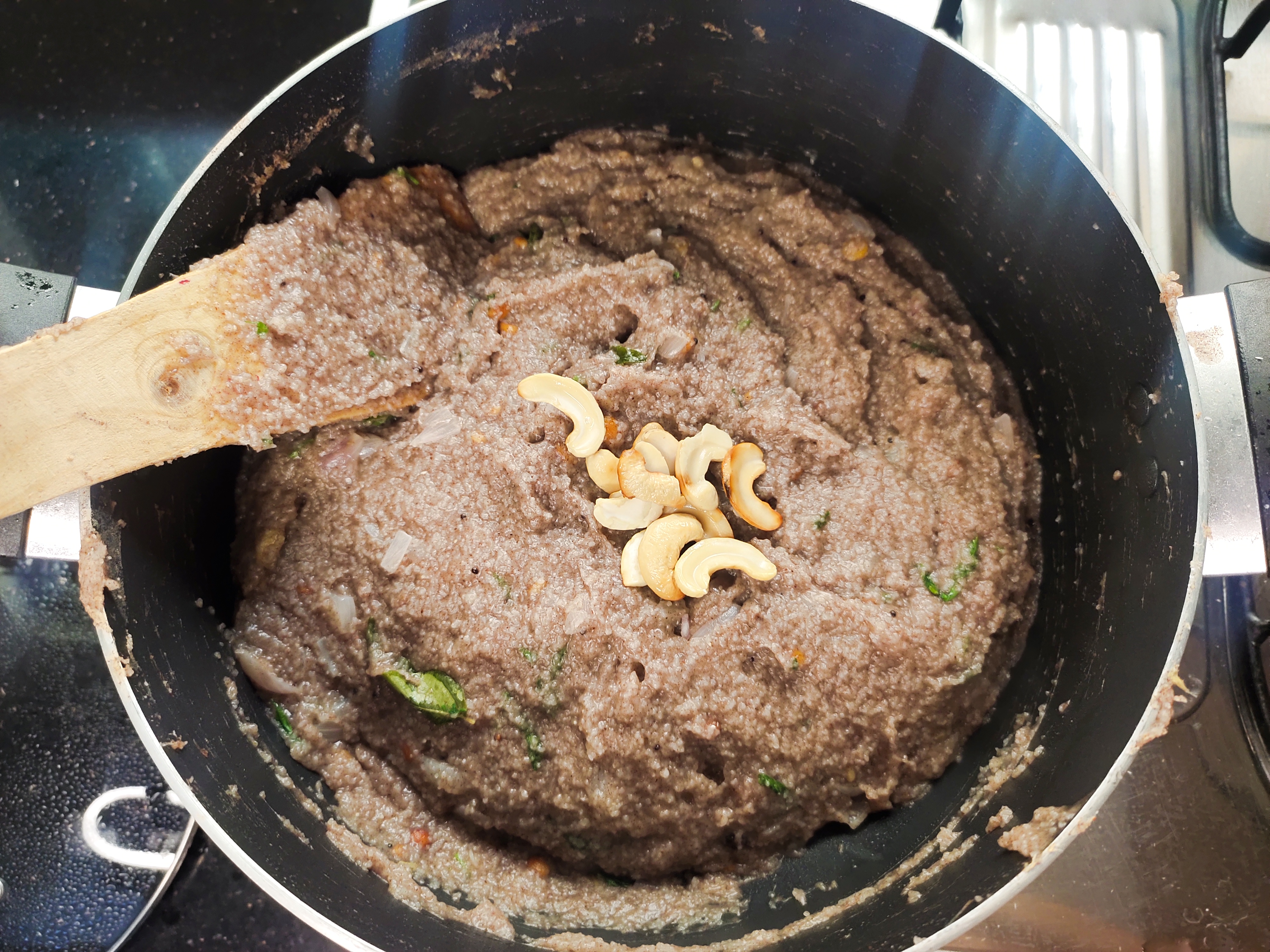Later open the lid and stir well. When it comes together, add 2 tbsp coconut oil, coriander leaves and roasted cashew.