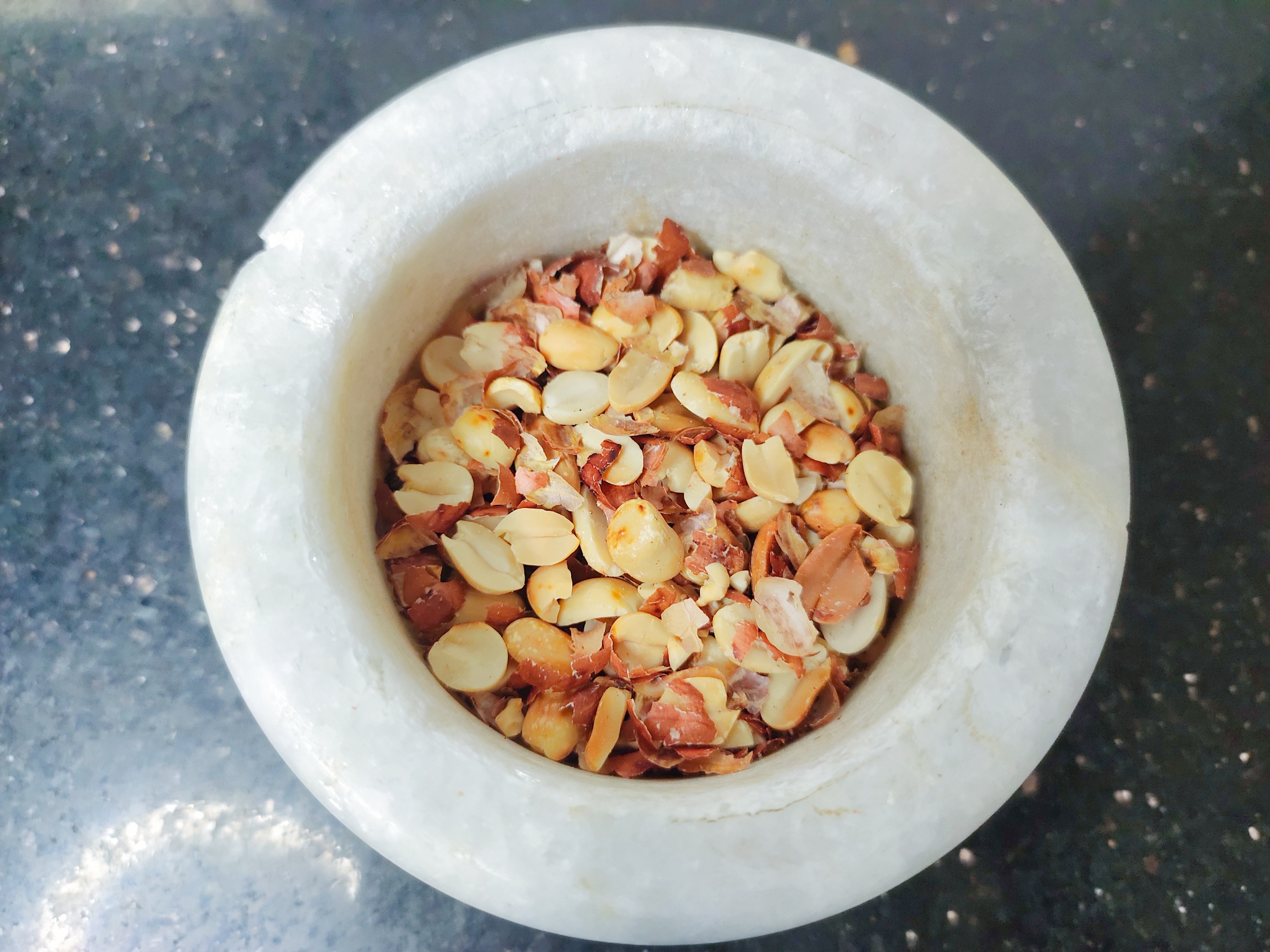 Take 1/4 roasted peanuts and break them into half using mortor and pestle.
