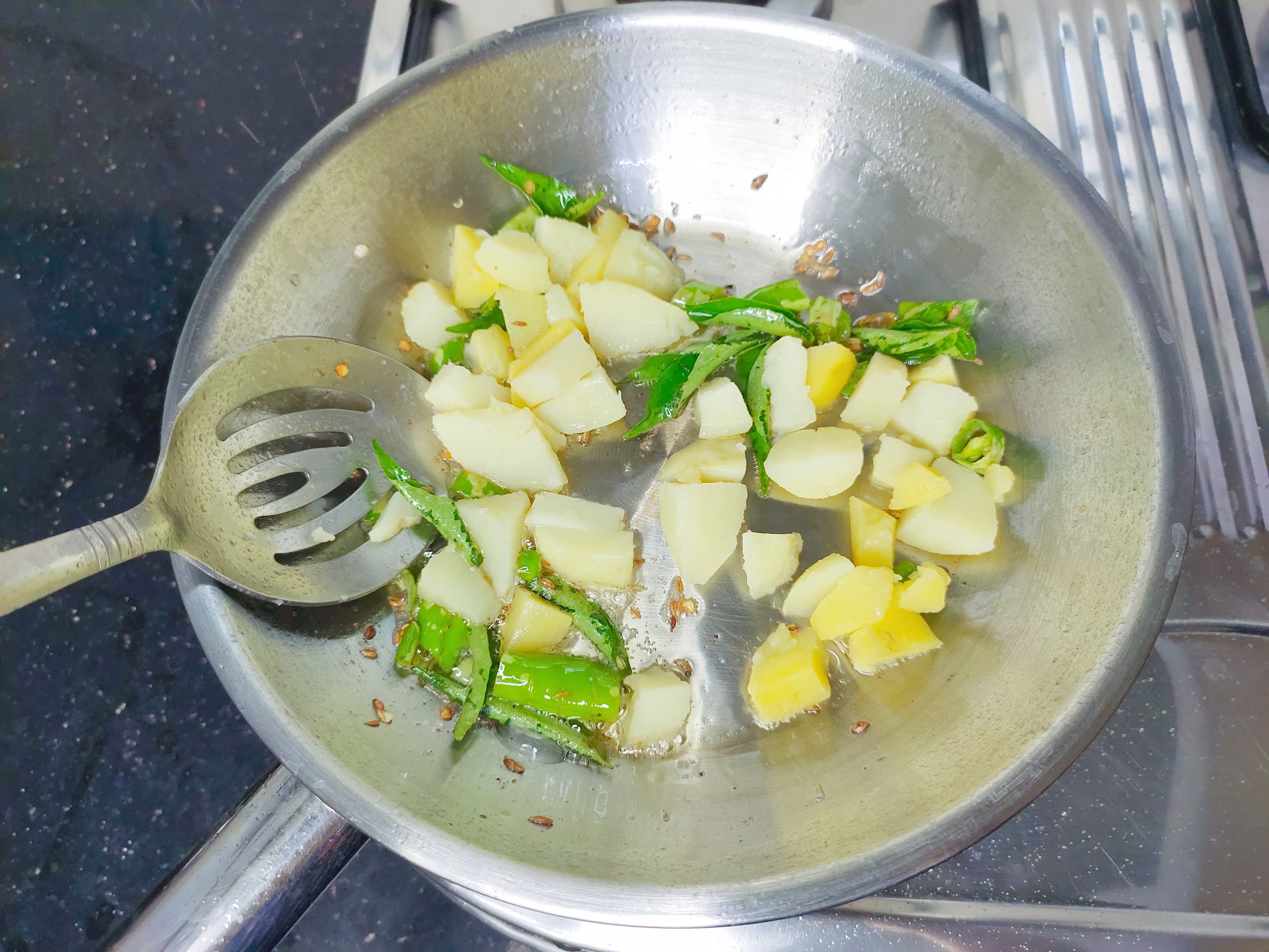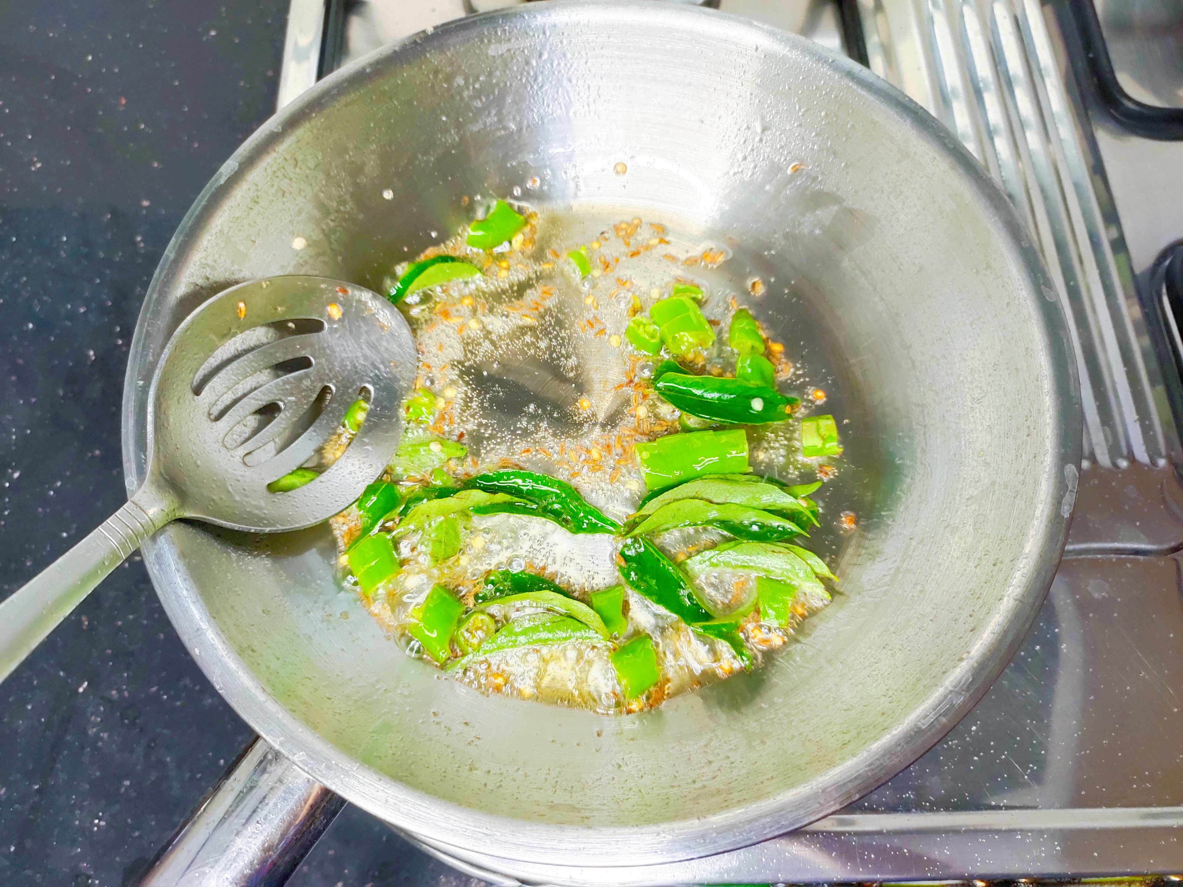 Heat oil in a pan. Temper 1/2 tsp cumin, curry leaves and 3 chopped green chillies.