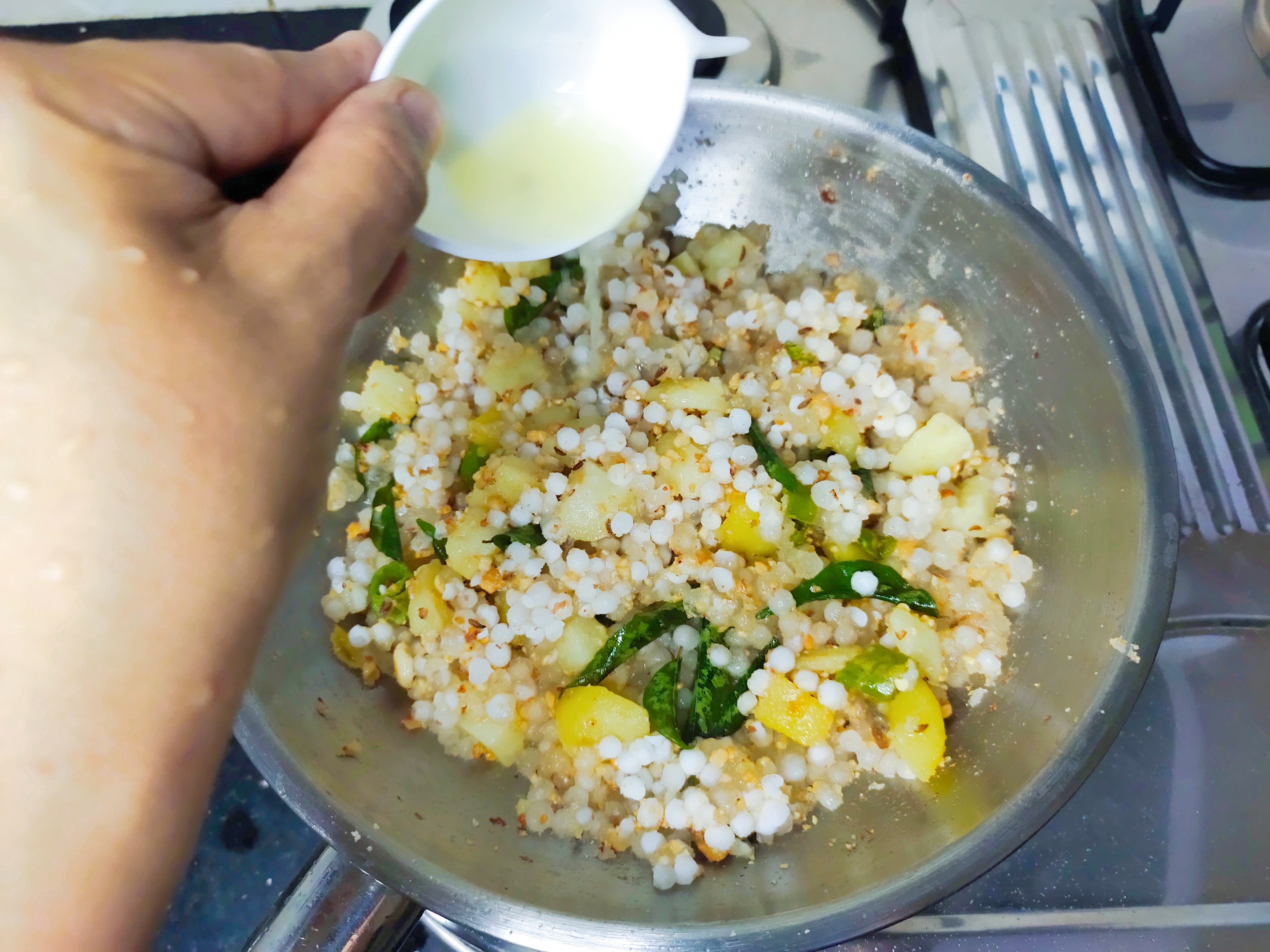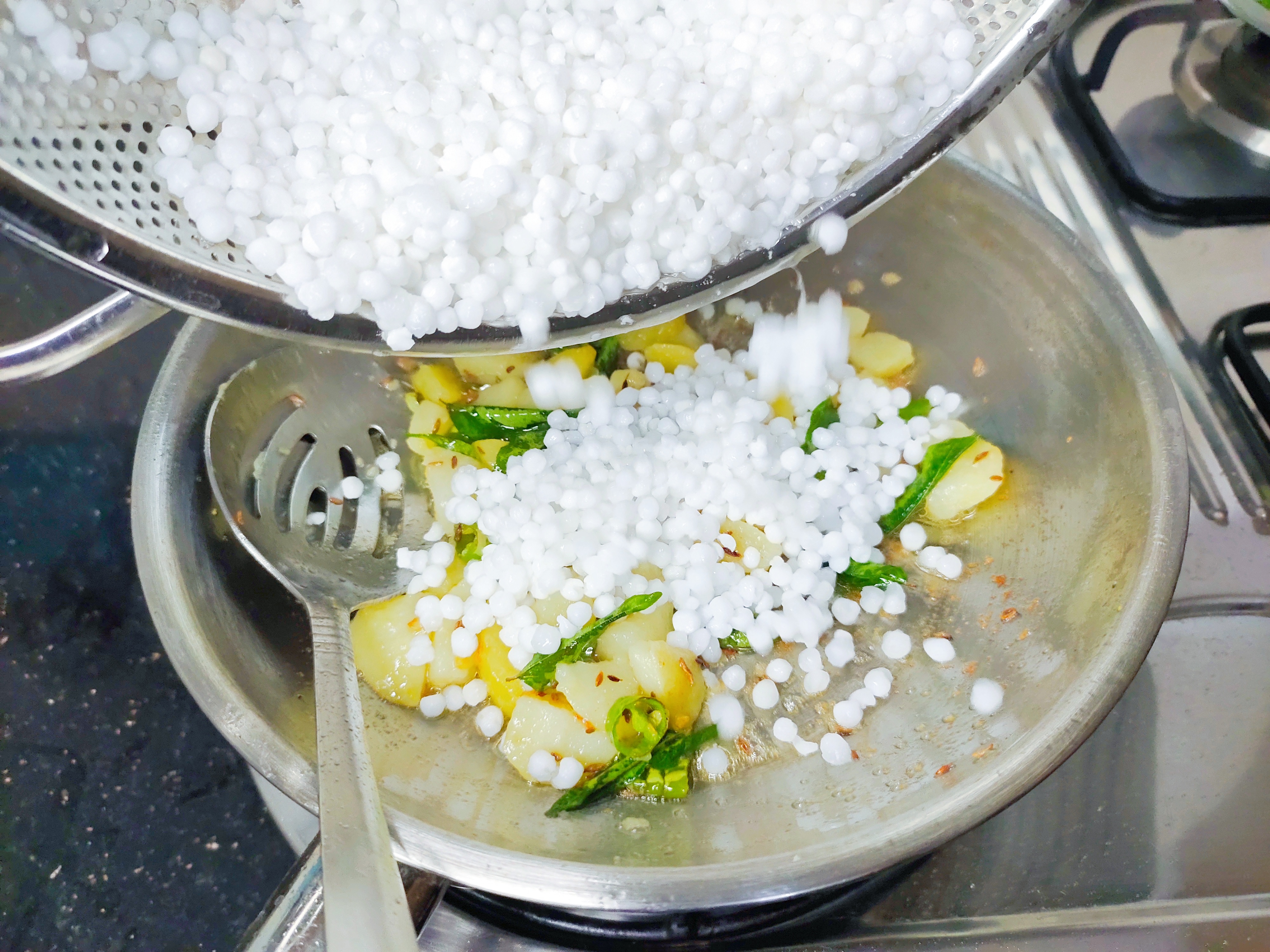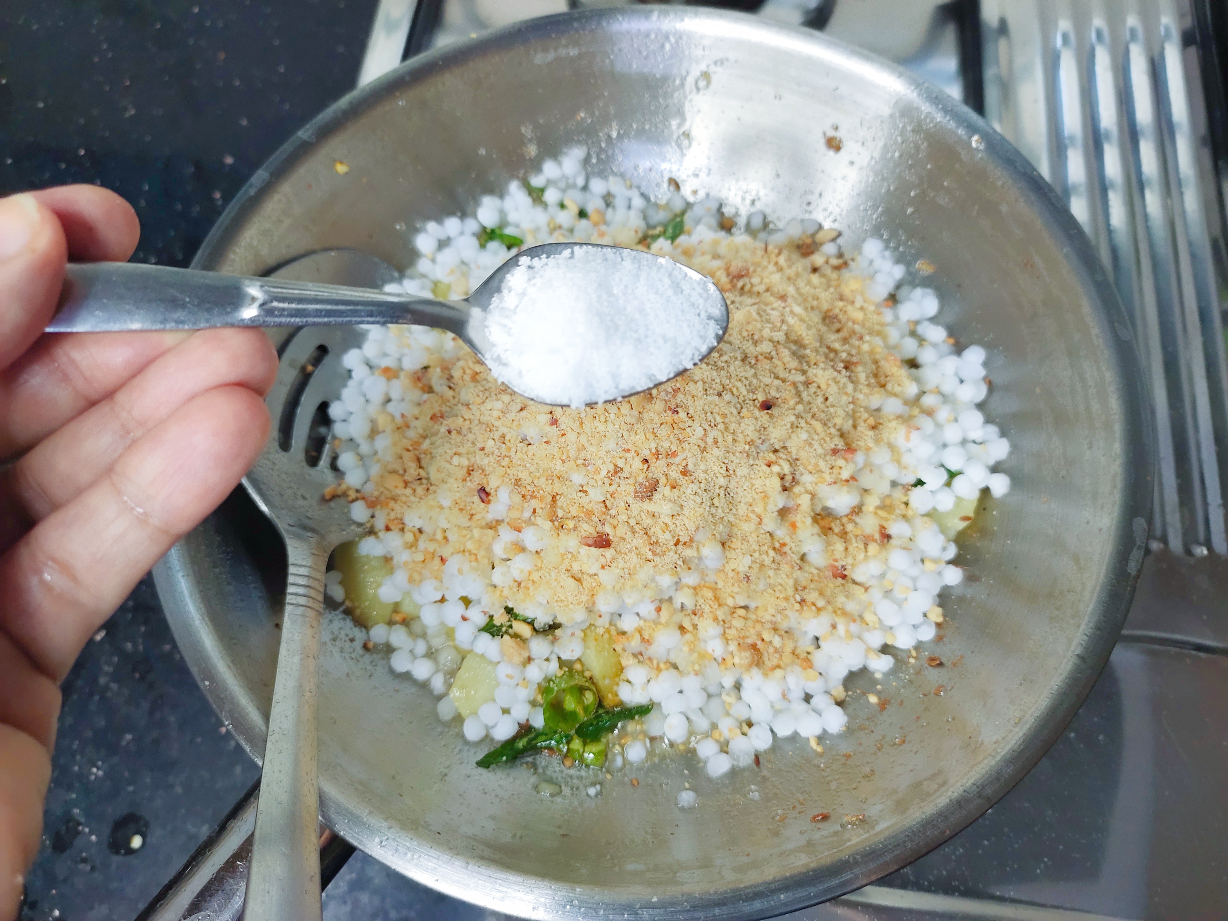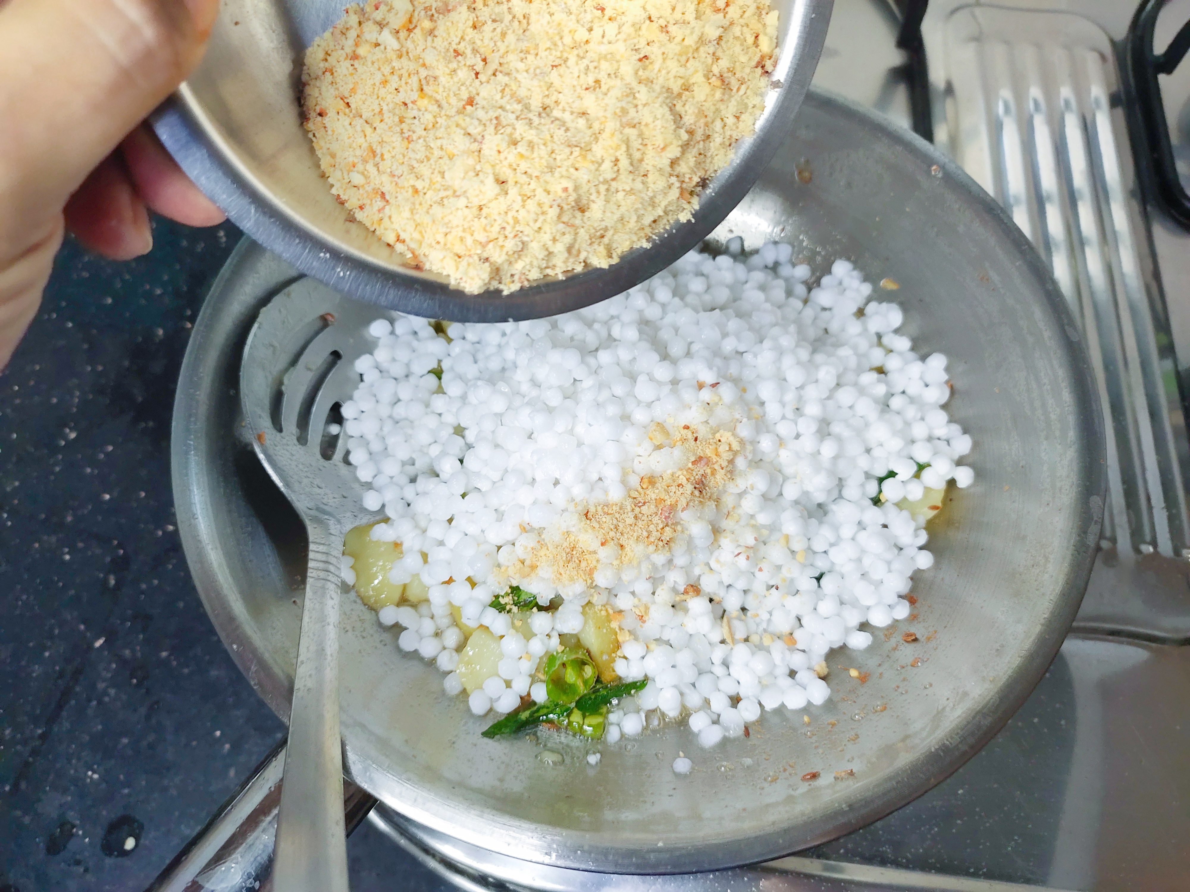 Add cooked, chopped potatoes, sabudana, peanut powder and salt.
