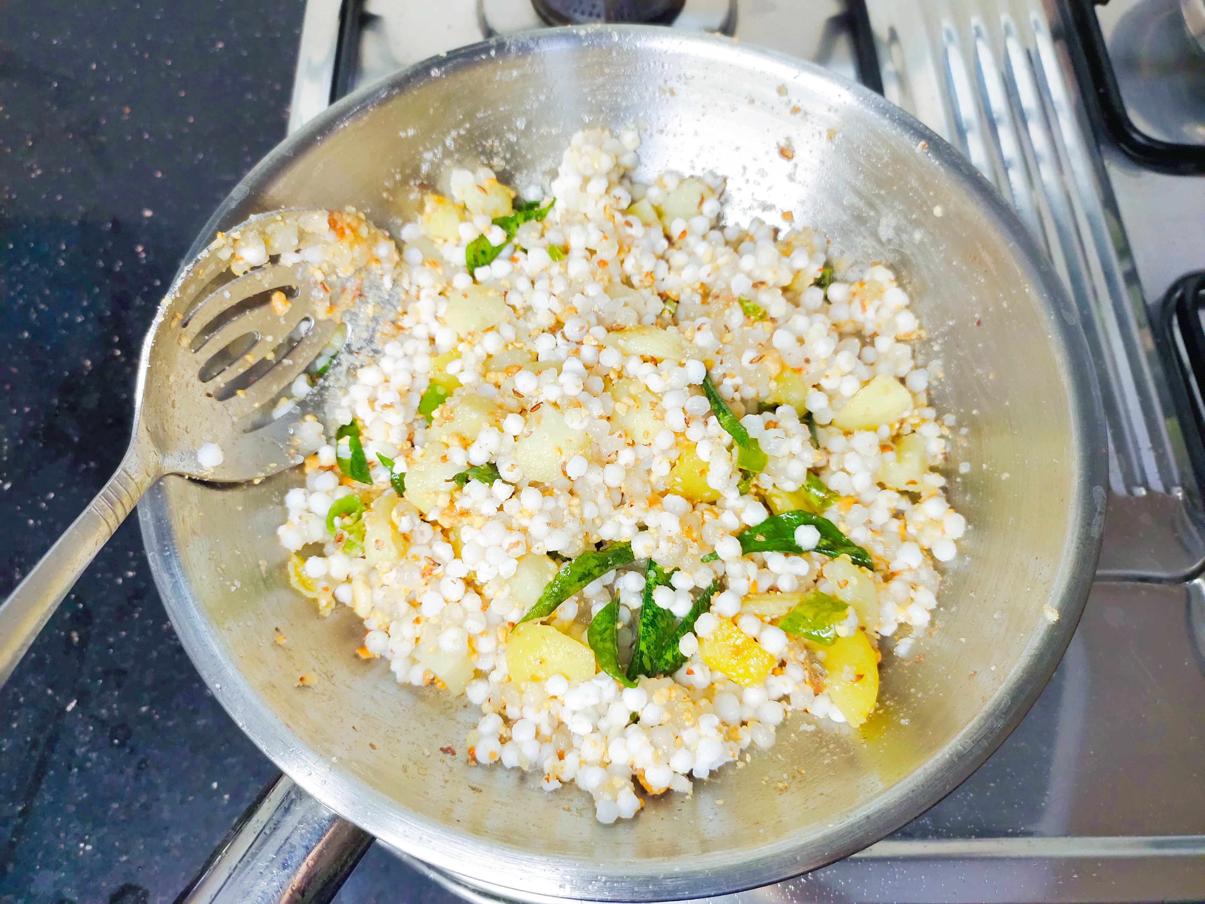 Cooking it for a long time makes sago sticky and turn to lumps. The starch in it clumps up to become gluey, chewy and sticky. Avoid using cast iron pan to prepare this sago khichdi. They easily get stuck to cast iron pan due to extreme heat.