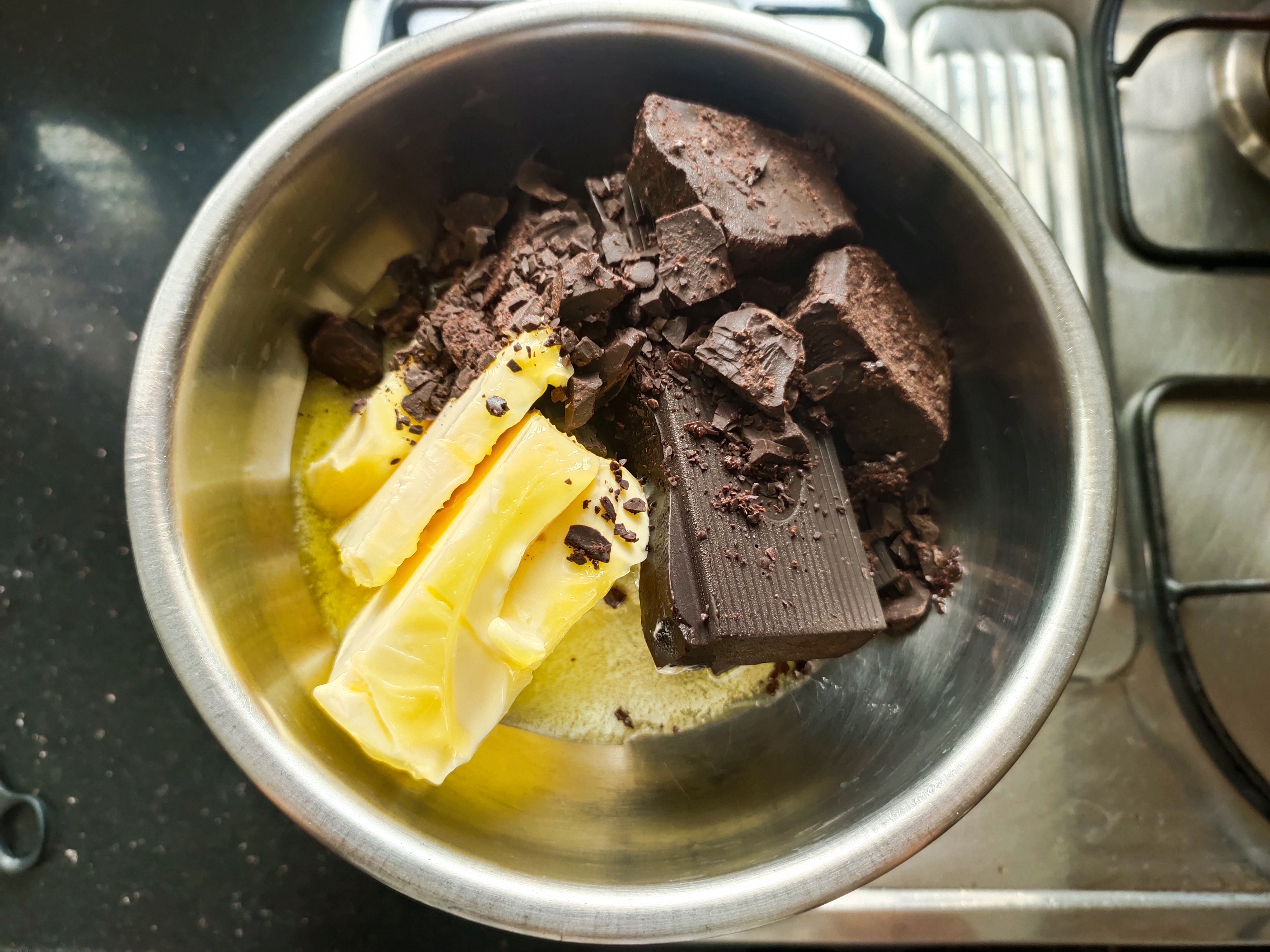 Make a saucepan filled with 2 inch water set over low heat. Place a bowl with dark chocolate and butter over the saucepan. Watch as they melt into gritty looking mixture.