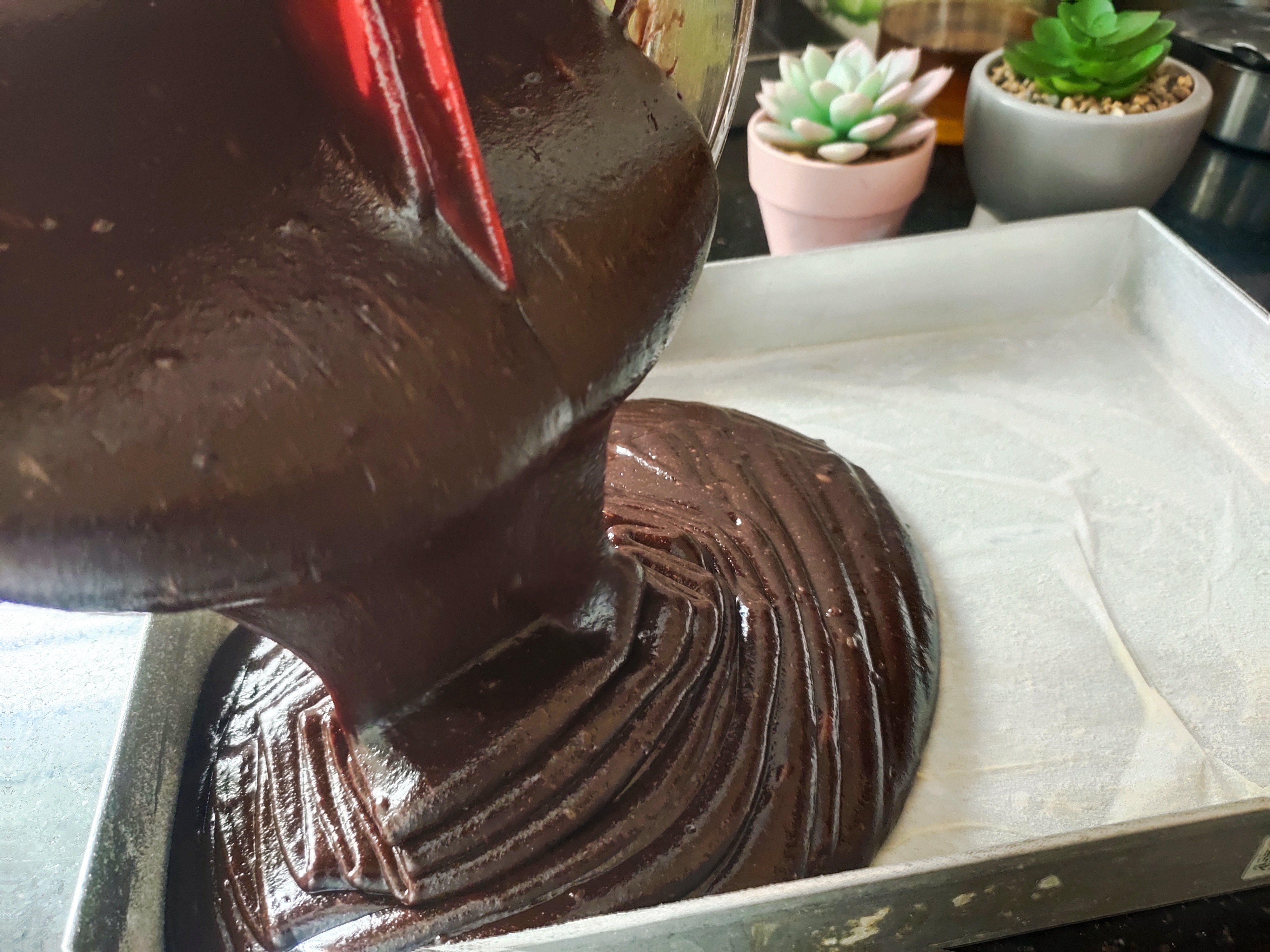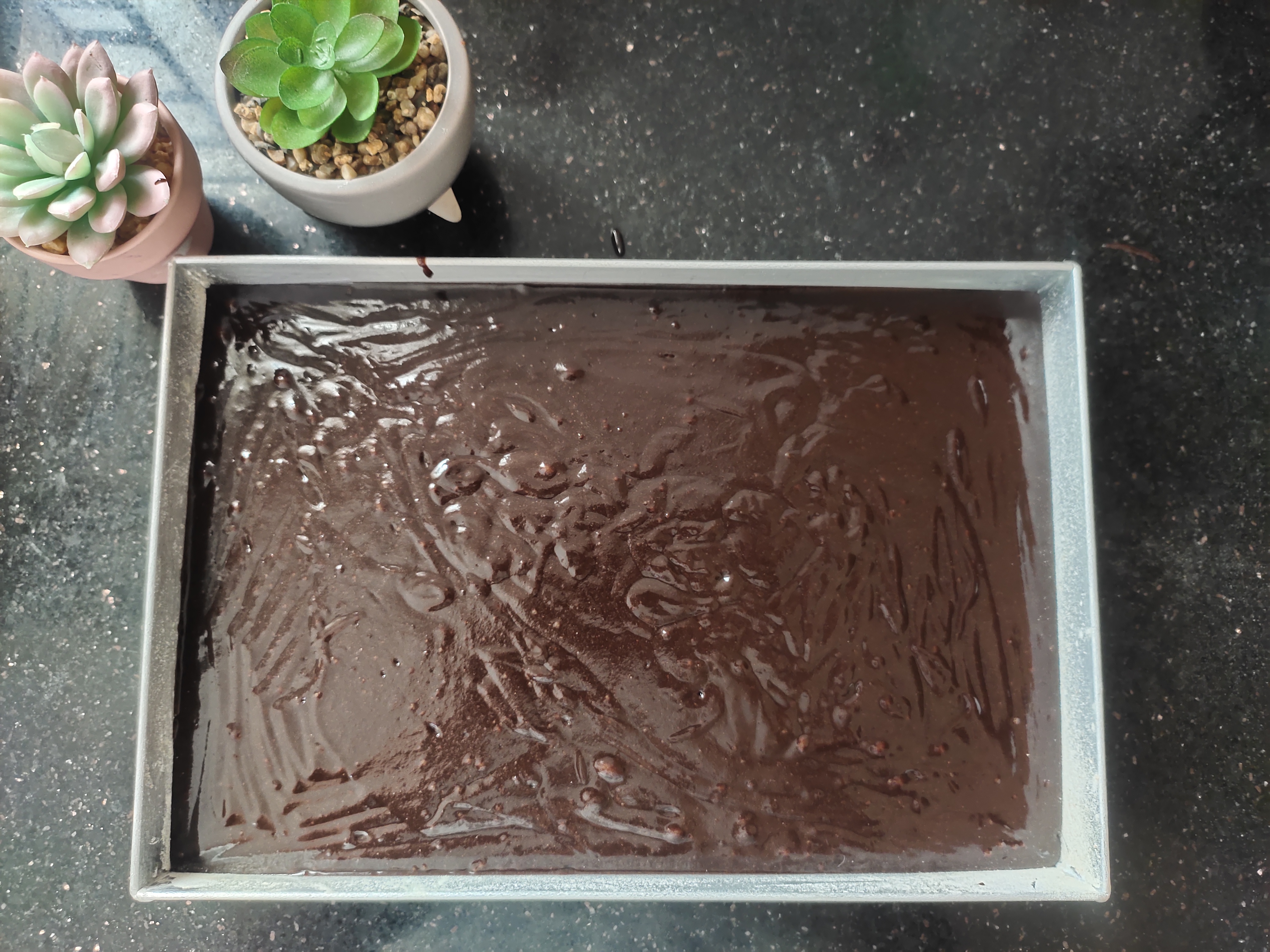 Tap the baking pan to remove air bubbles and bake the brownie in a preheated oven for 30 minutes @ 160°C.