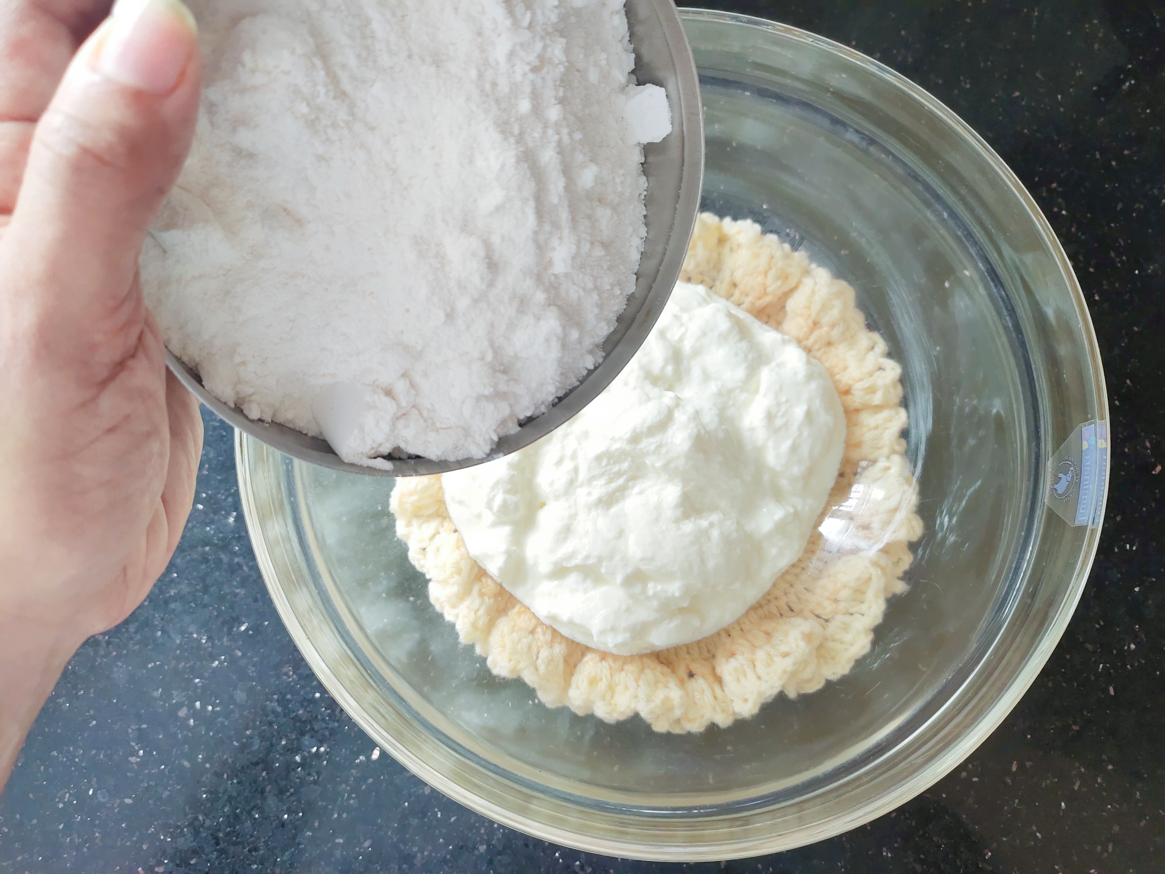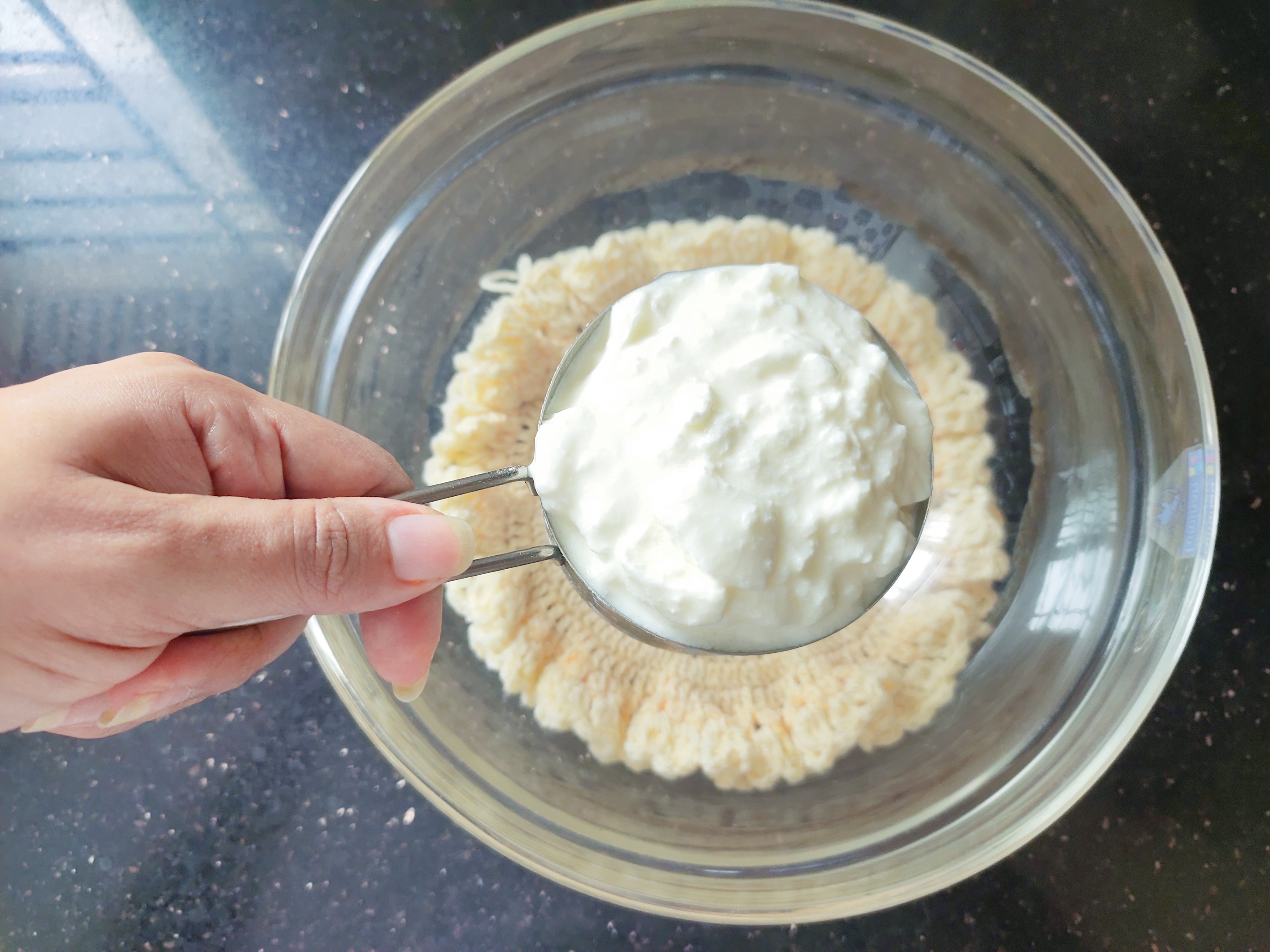 Take 1 cup (250 ml cup) thick yoghurt or hung yoghurt in a bowl.