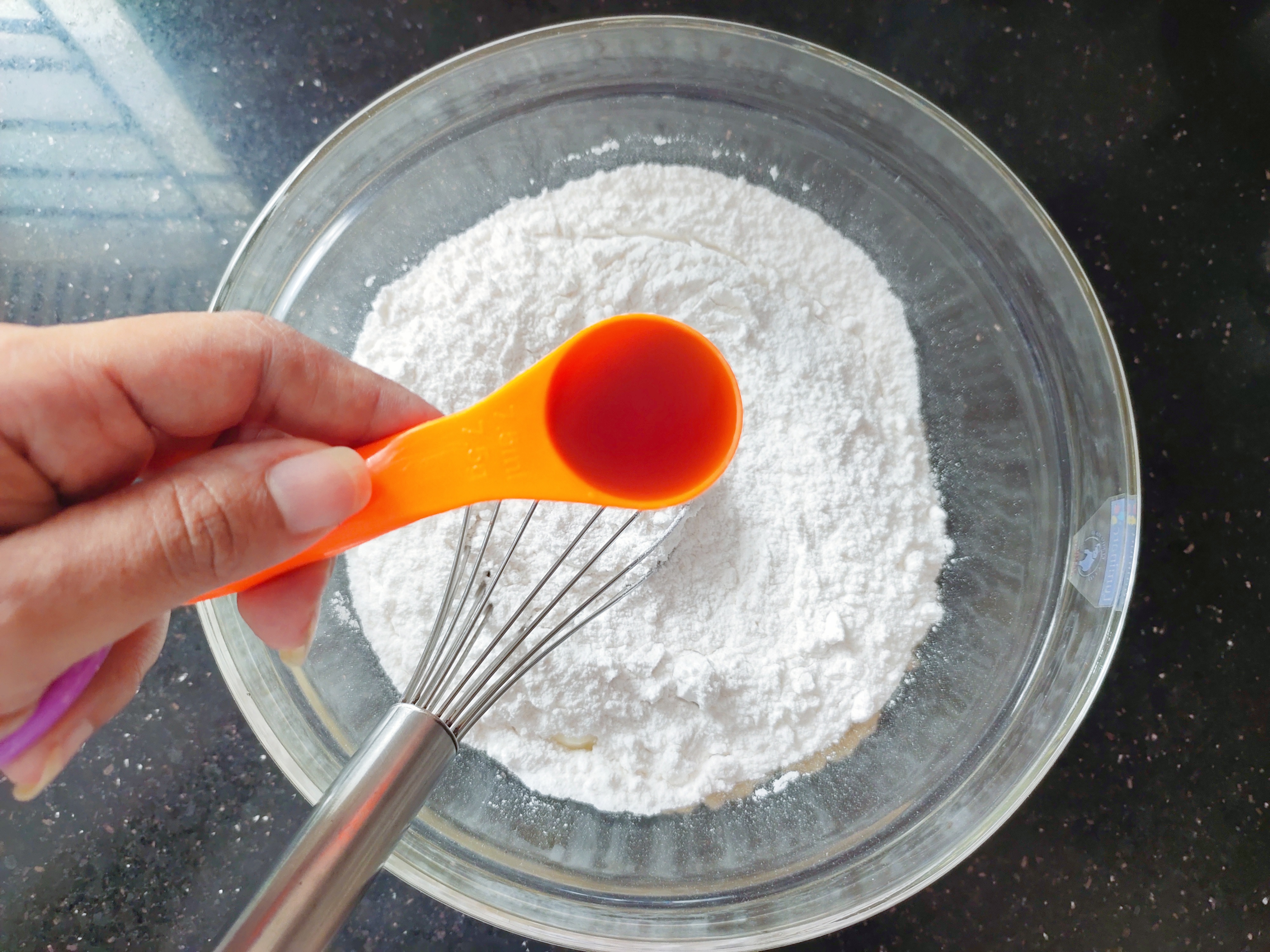 In a mixer jar add 380gm sugar and give it a pulse. Add this powdered sugar to the bowl.
