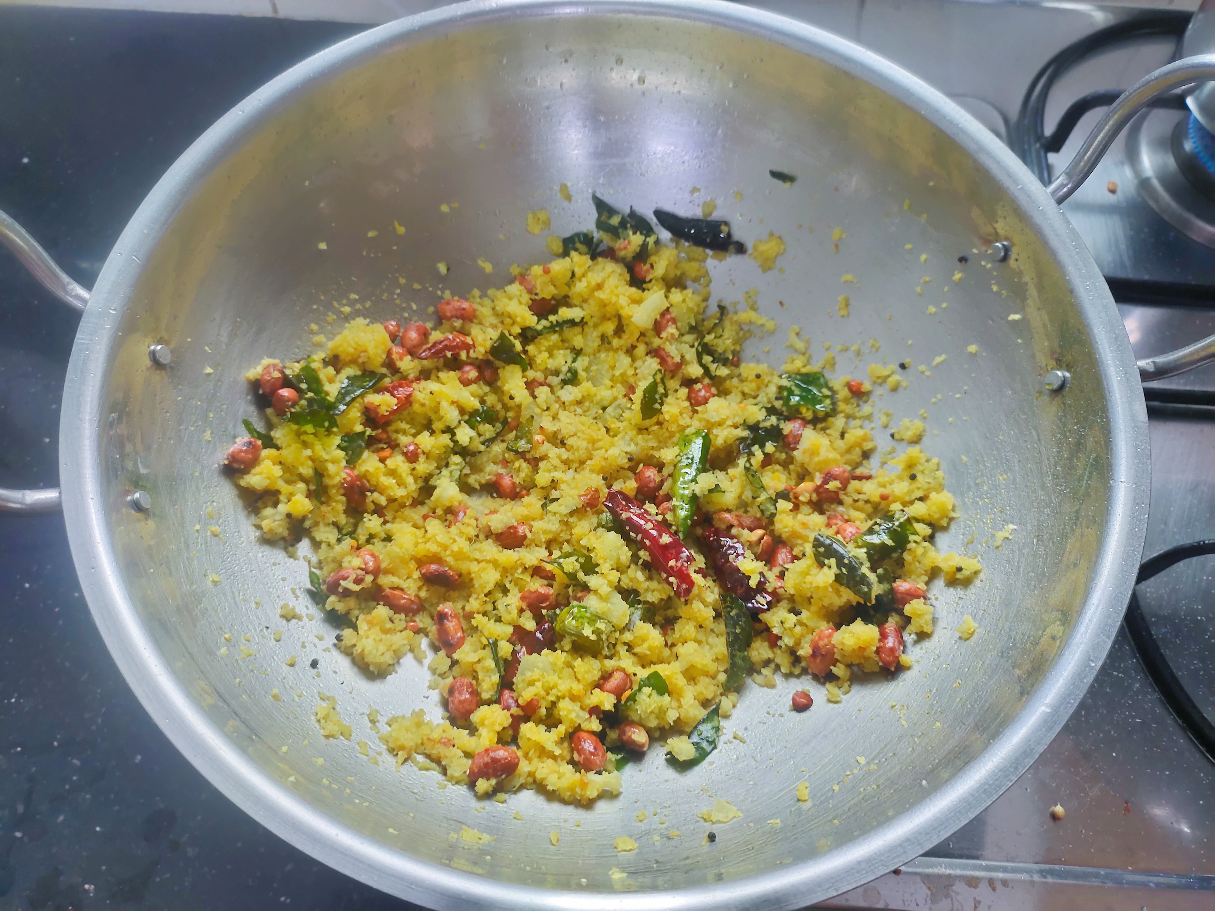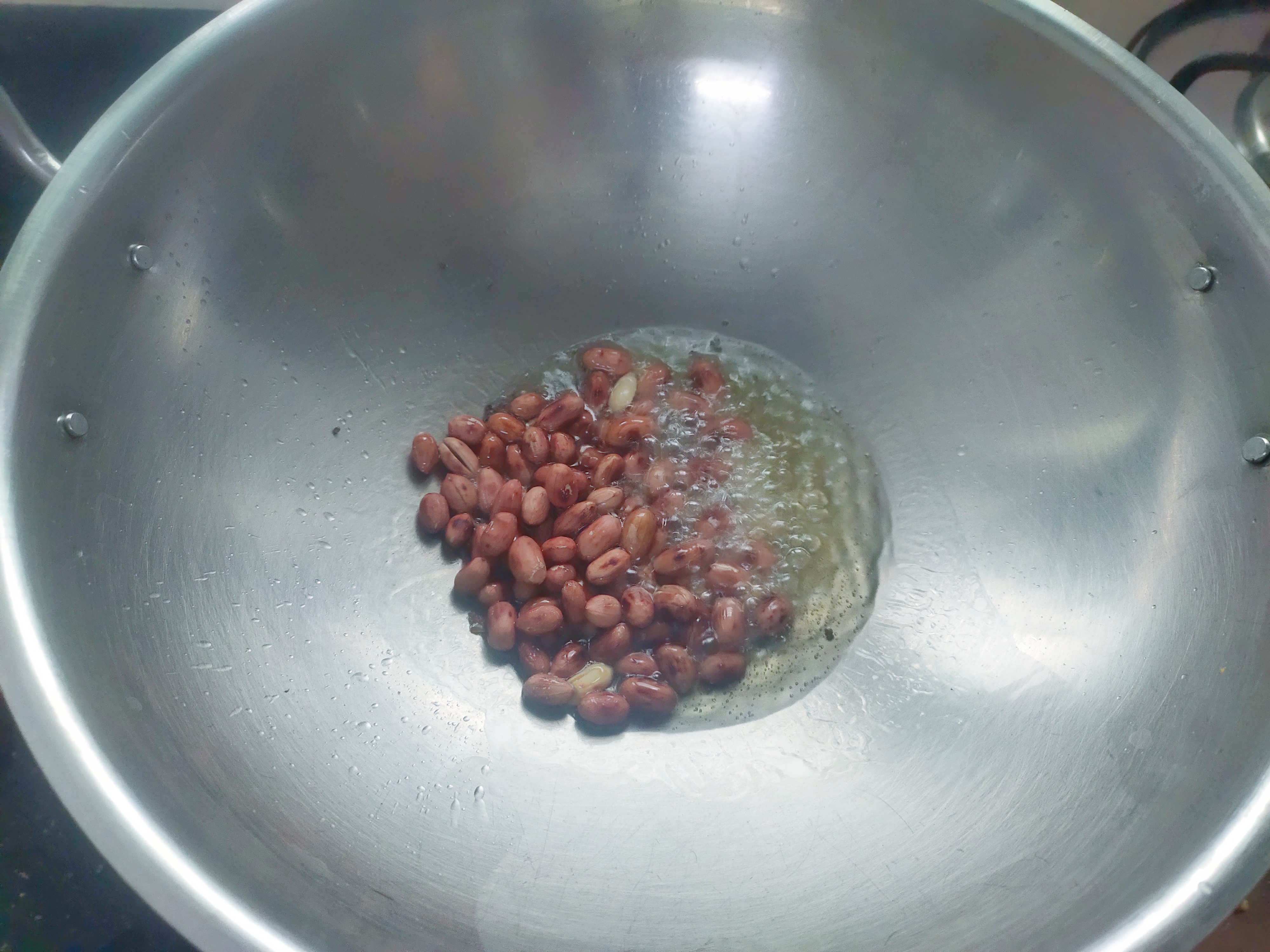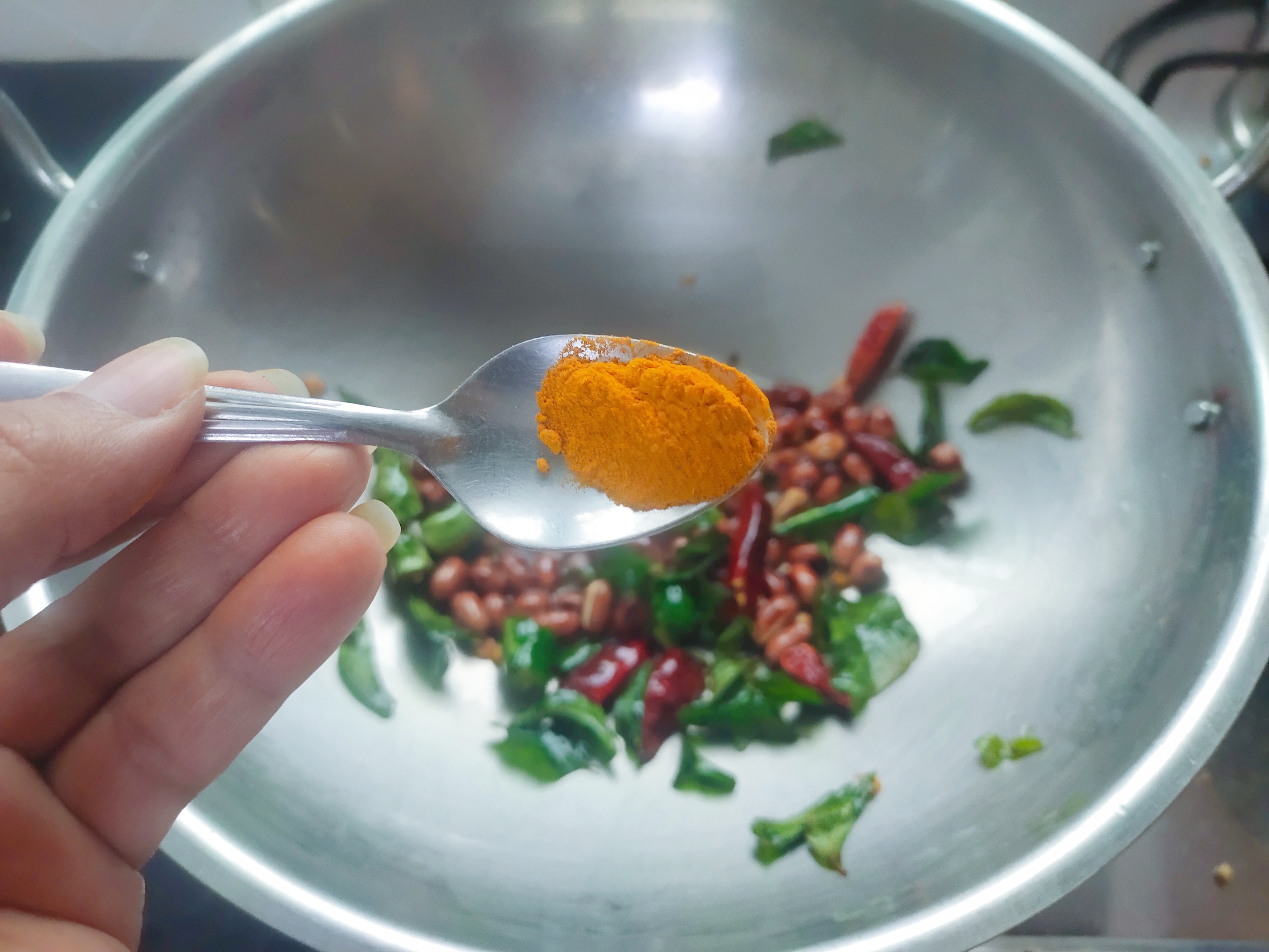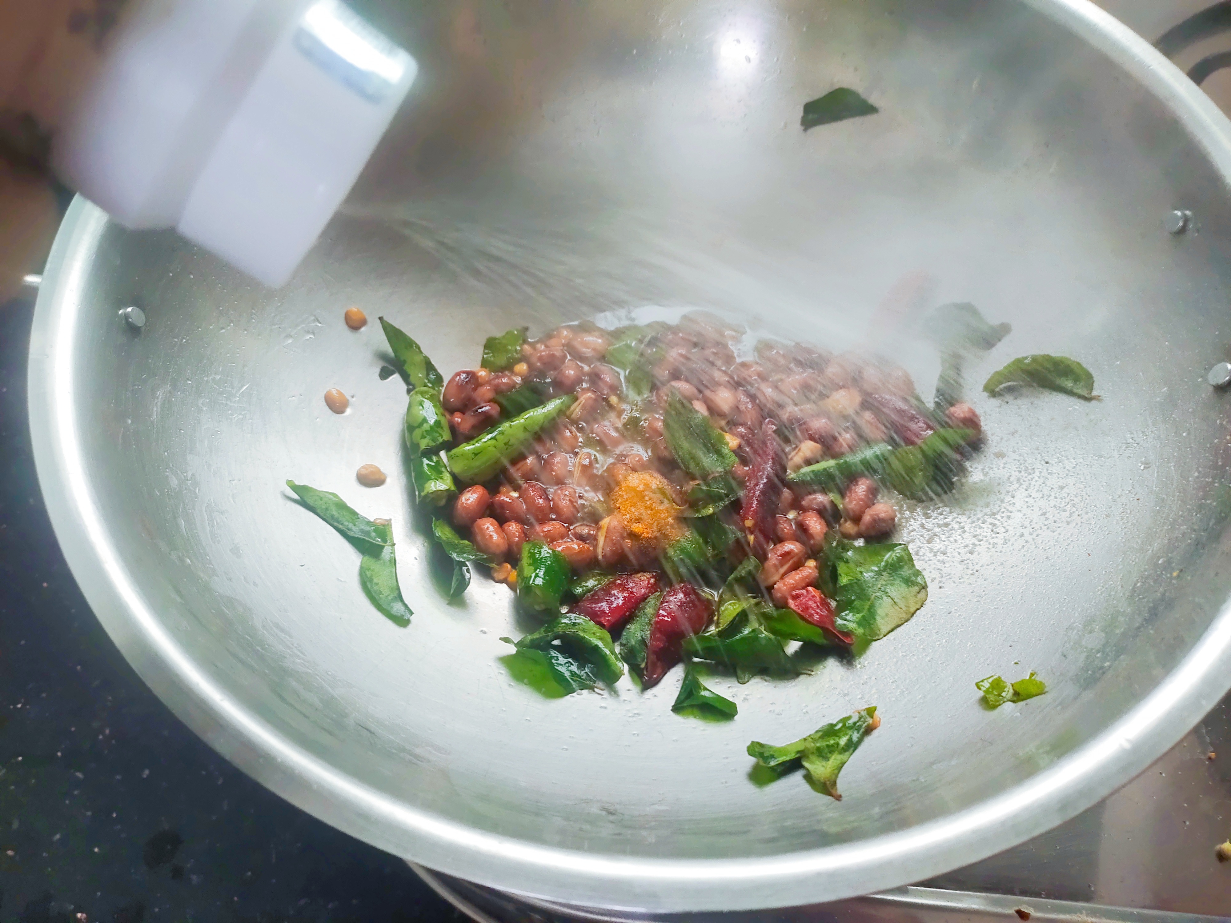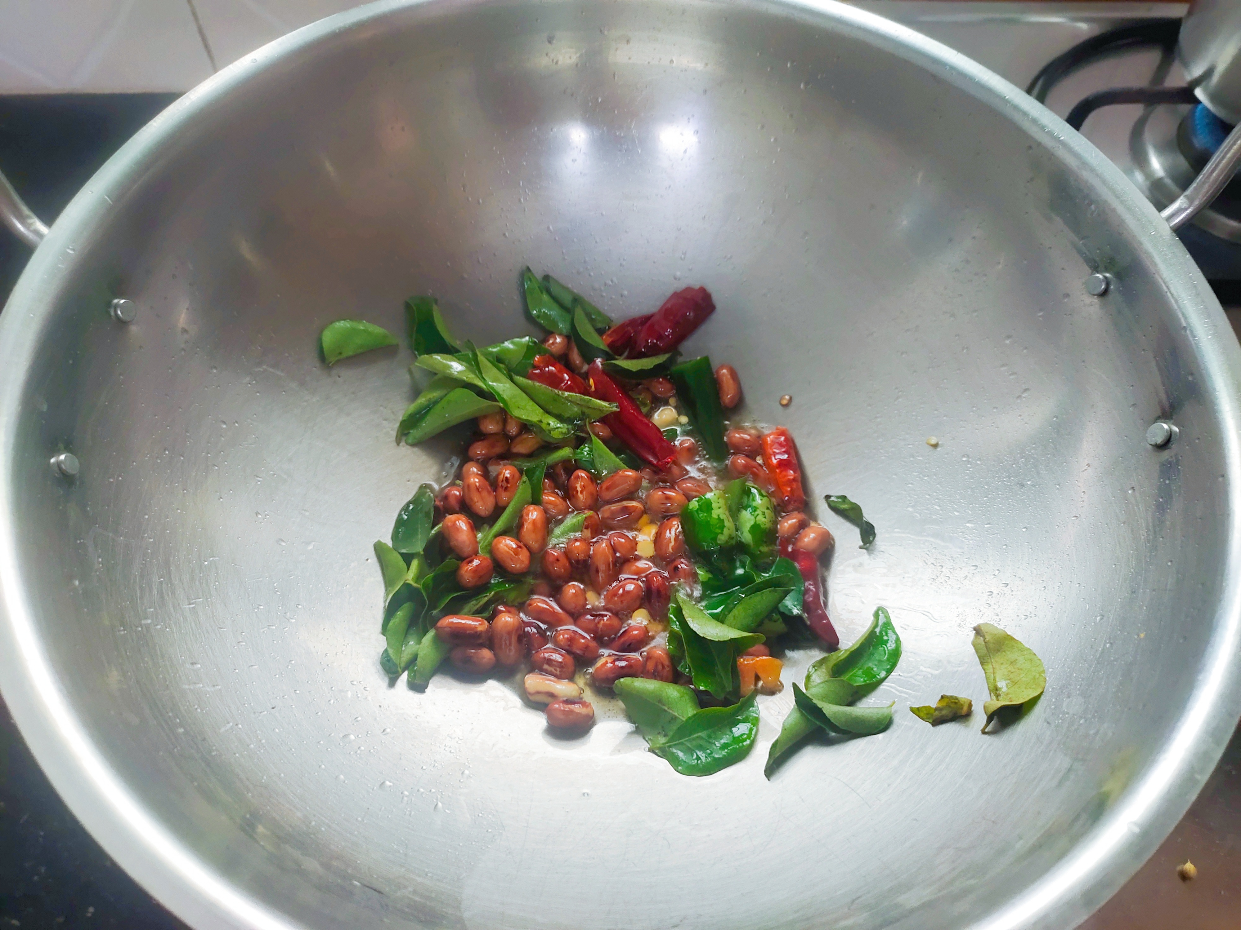 Heat oil in a pan. Temper mustard seeds allow it to crackle. Add urad dal, channa dal and peanuts.