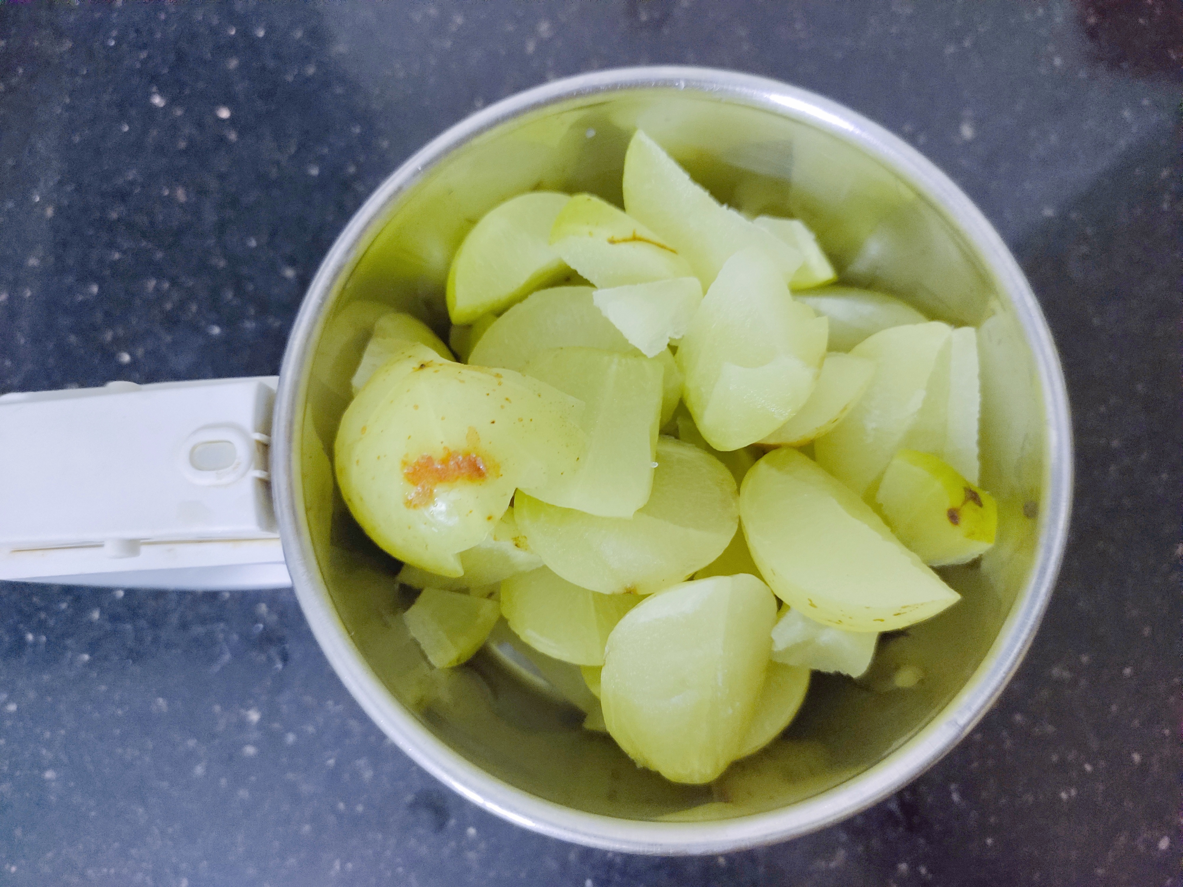 Wash and chop gooseberries. Add it to mixer jar and grind coarsely then set aside.