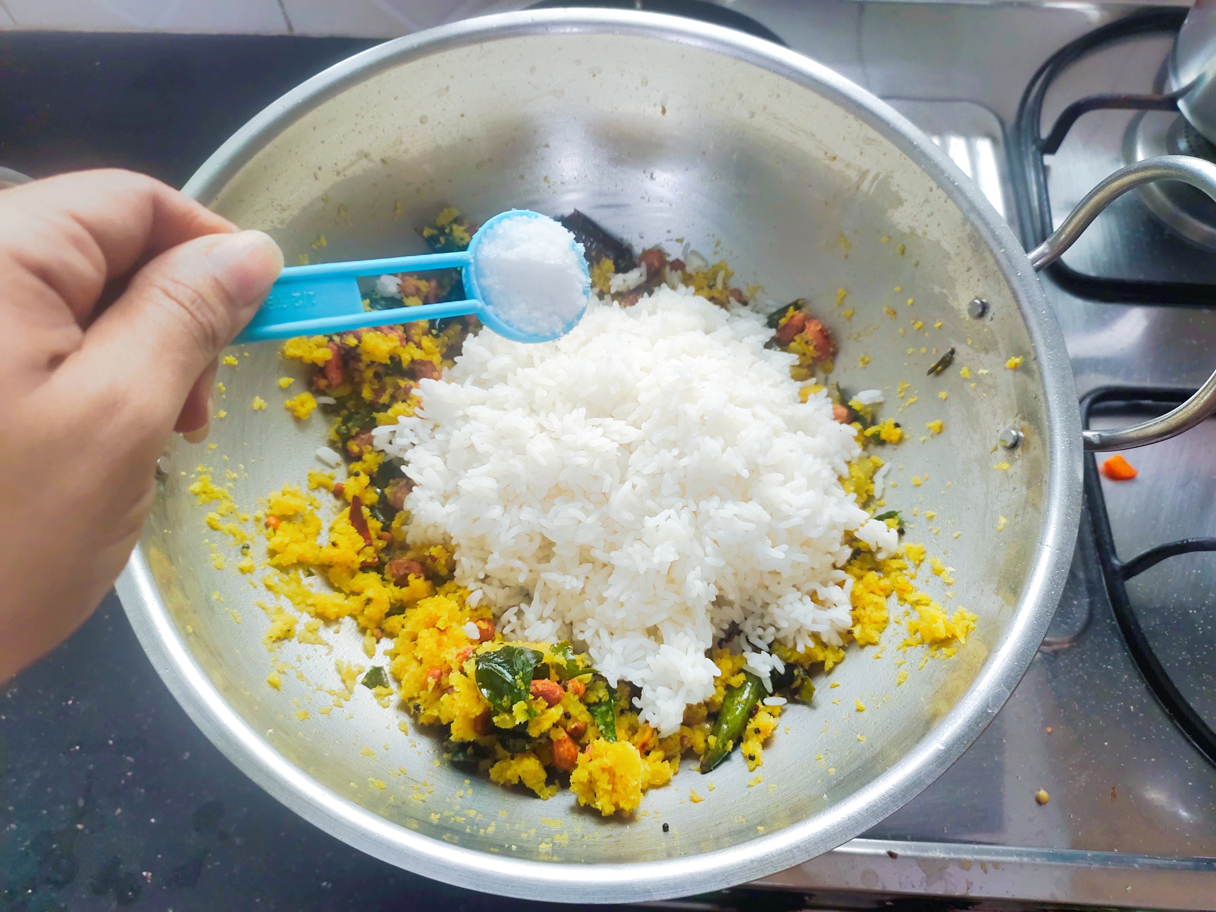 Gooseberry rice is done. Wait for a minute in pan for flavours to infuse then serve. This rice goes well with potato fry or raw banana fry.