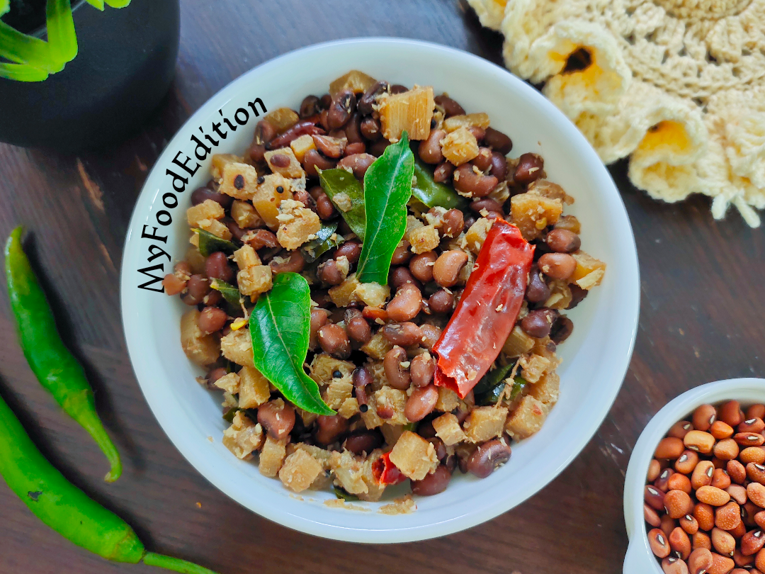 Banana stem cowpeas stir-fry is packed with fiber and protein. This sidedish can be prepared for lunch or you can wrap it inside the roti for dinner. Cowpeas are easy to prepare and provide far more nutrition than many other legumes. One of the biggest problem in weight loss is over eating on cheat days or snacking between the meals. With the high fiber diet you can achieve your weight loss goal much quicker. Banana stem cowpeas stir-fry will make you feel full for longer period. Cow pea comes in different colours but for making this dish we usually use brown coloured one. They are also called as black eyed peas. Cowpea is mainly used in salads, gravies, as stir-fry for offering to God on festival or auspicious days and also in soups.