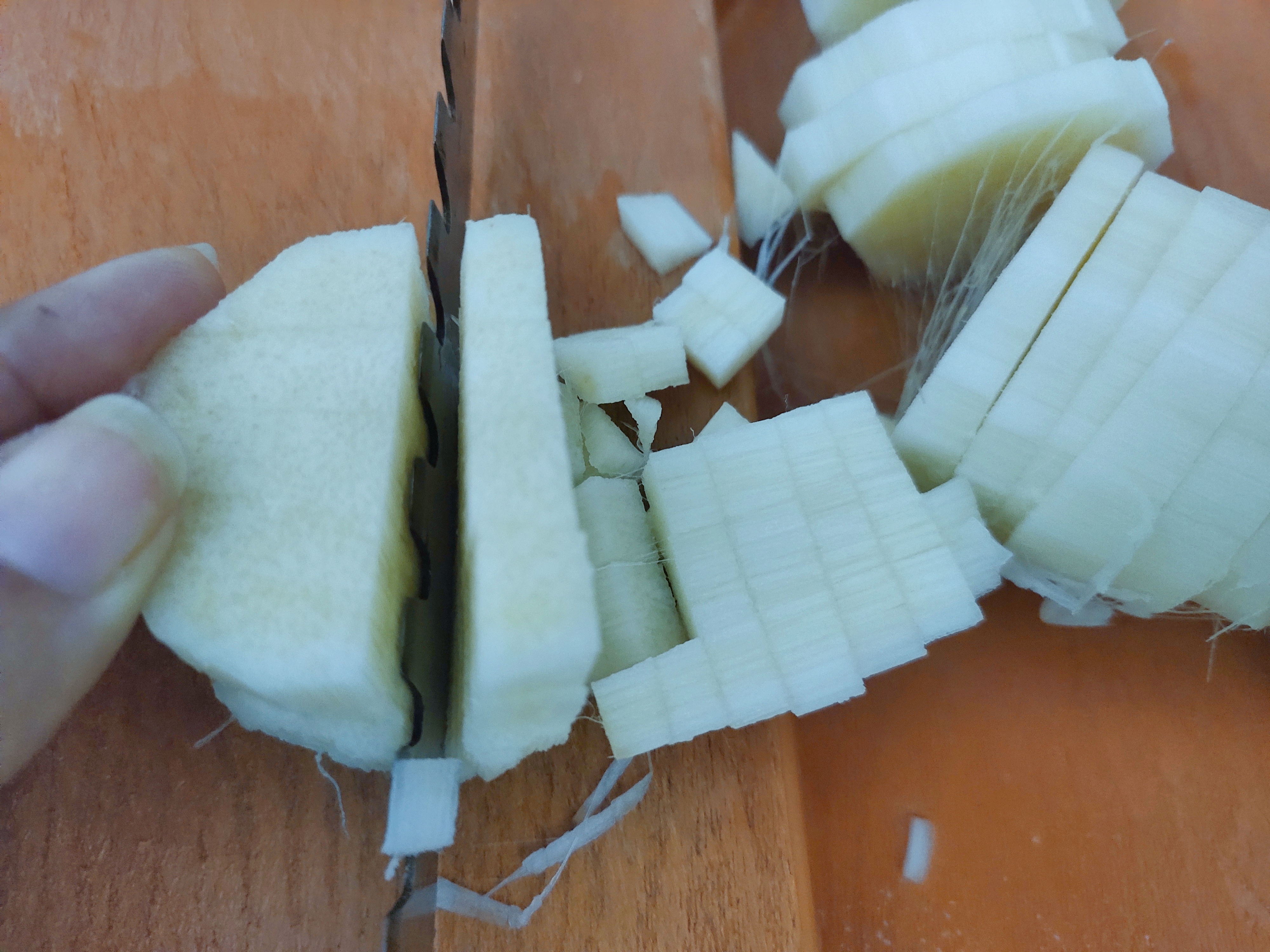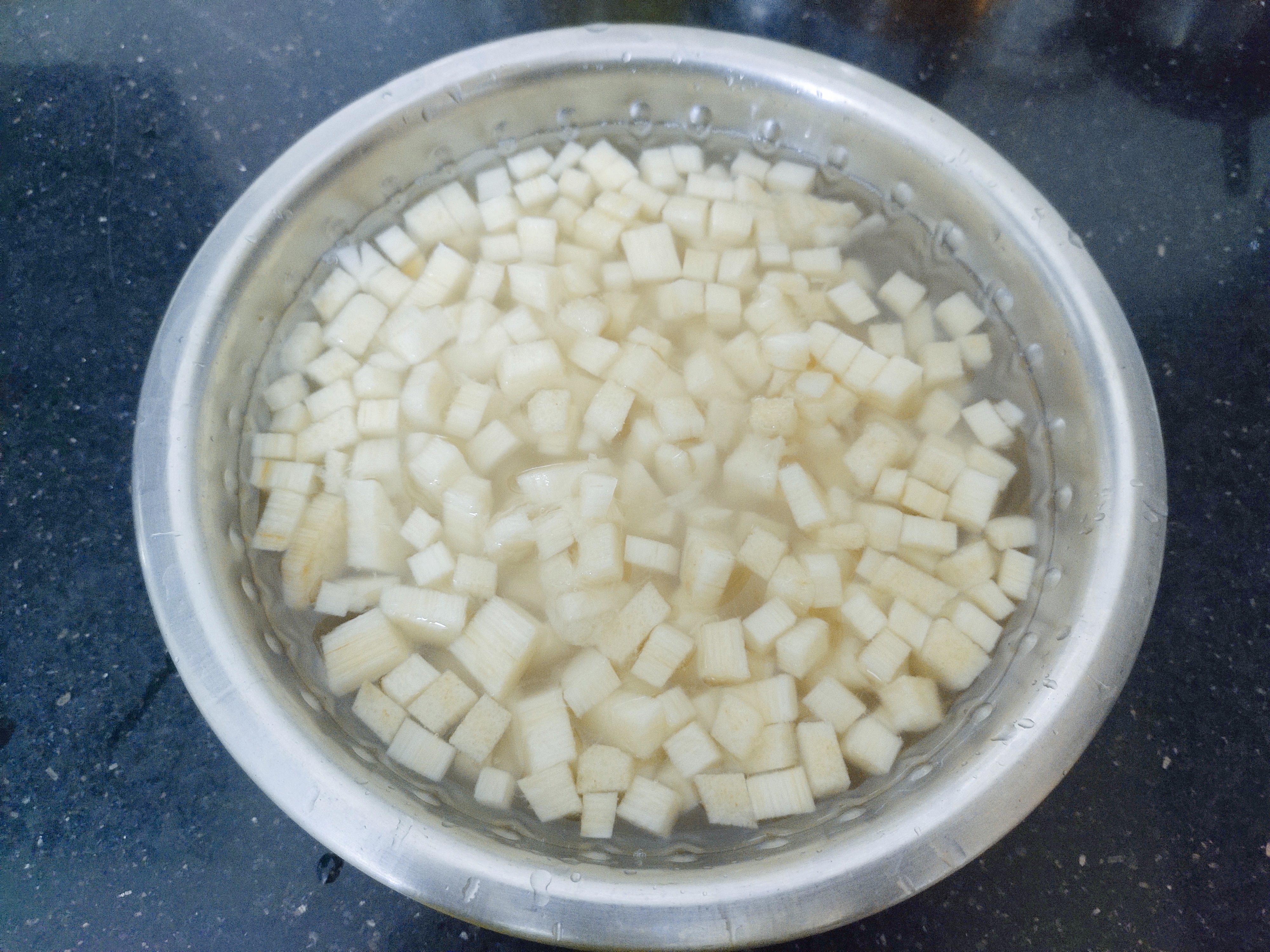 Remove the banana stem peel, cut it round, chop them into cubes.