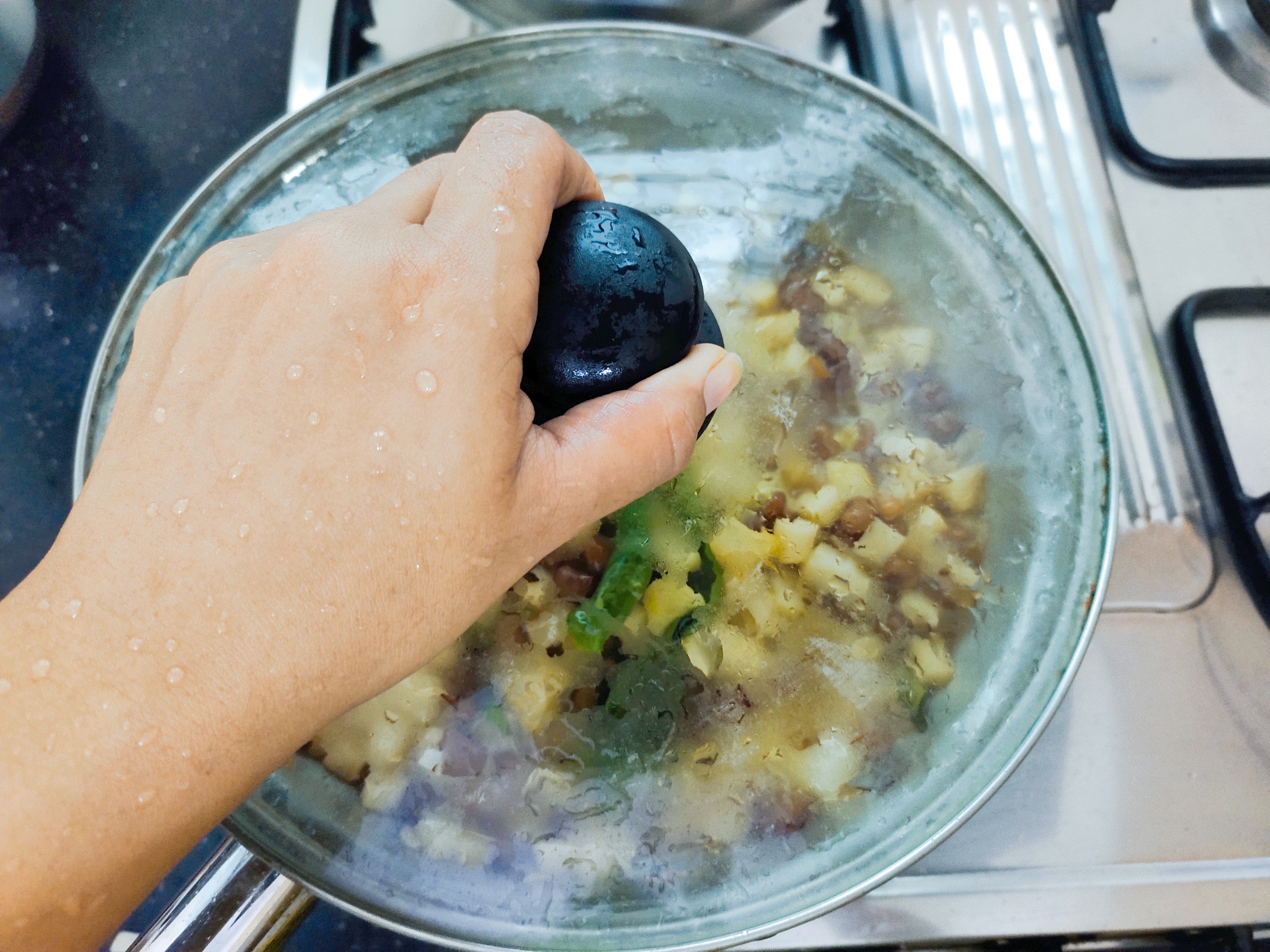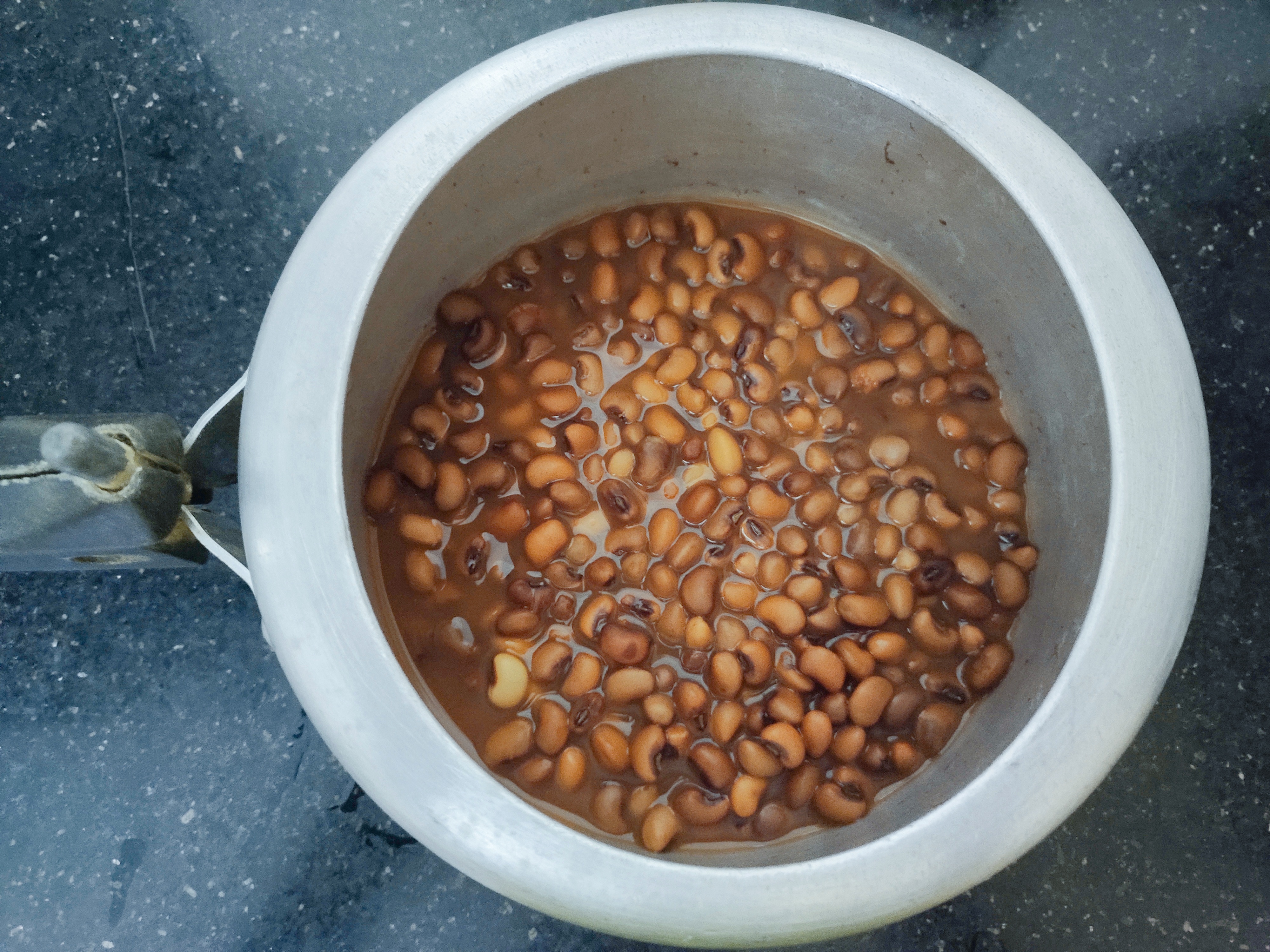 Soak 1/2 cup cowpeas overnight and cook for 2 to 3 whistles with the water used for soaking.
