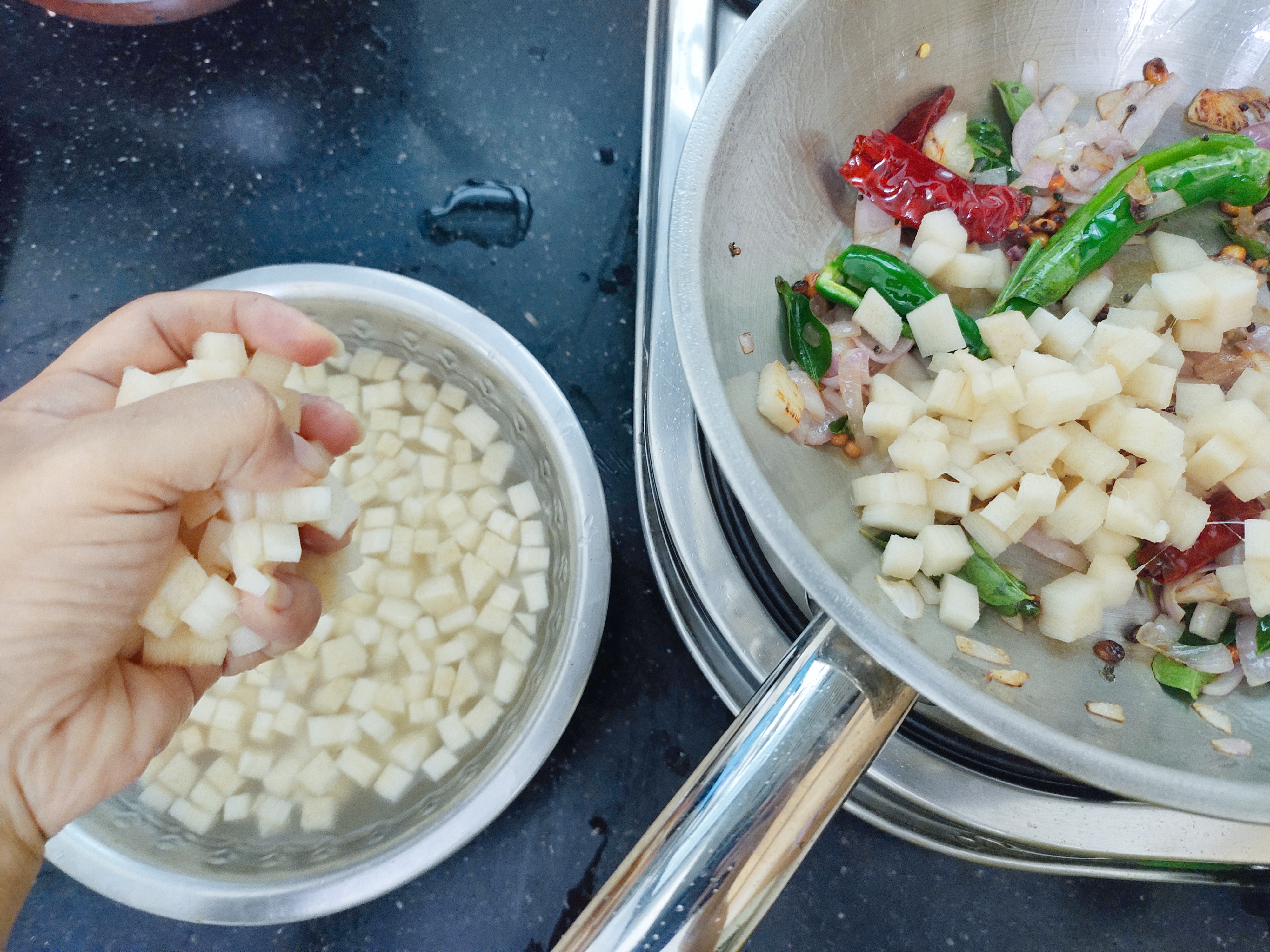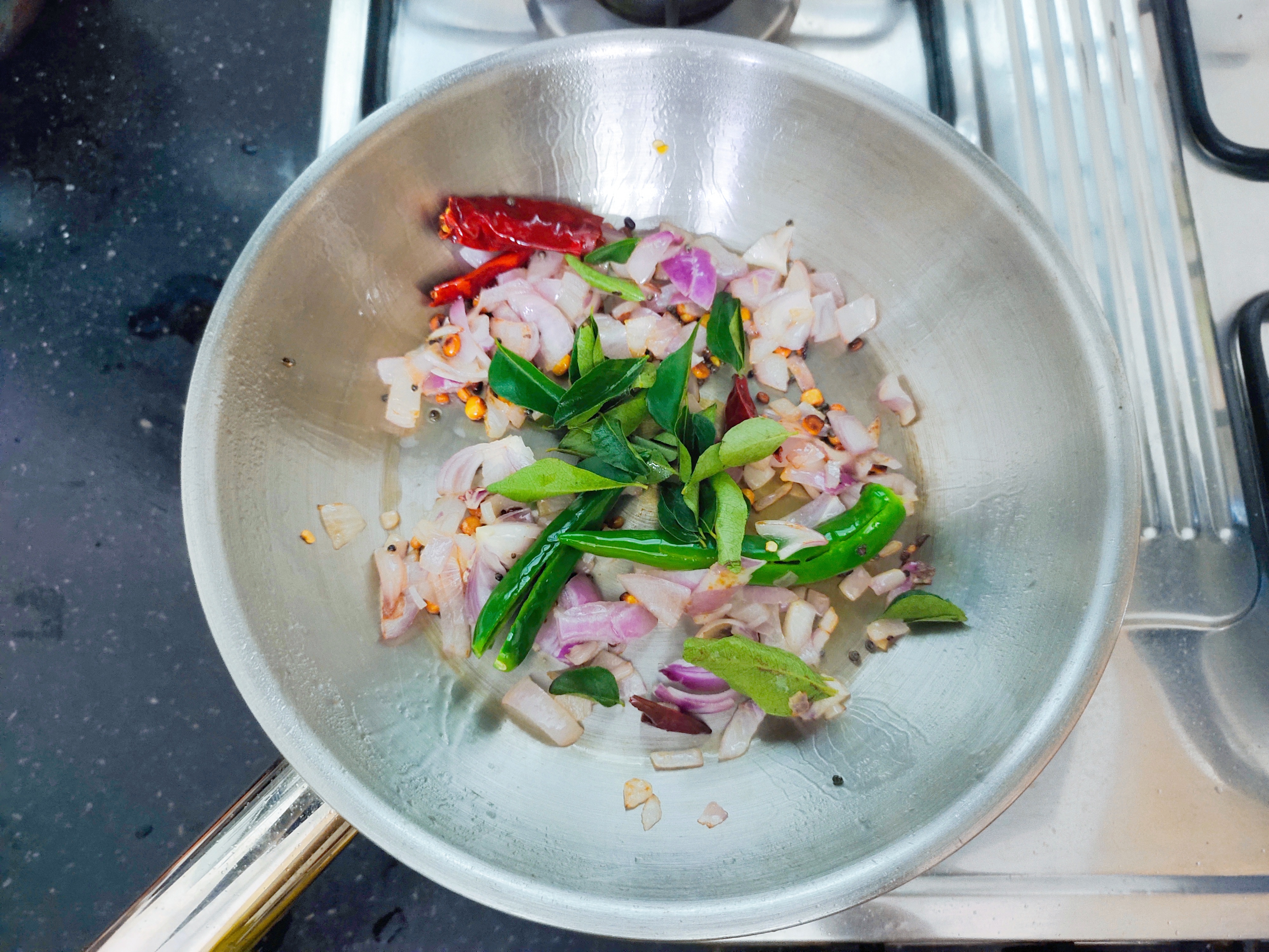 Saute 2 green chillies, 2 red chillies (deseeded chillies) and 1 chopped onions.