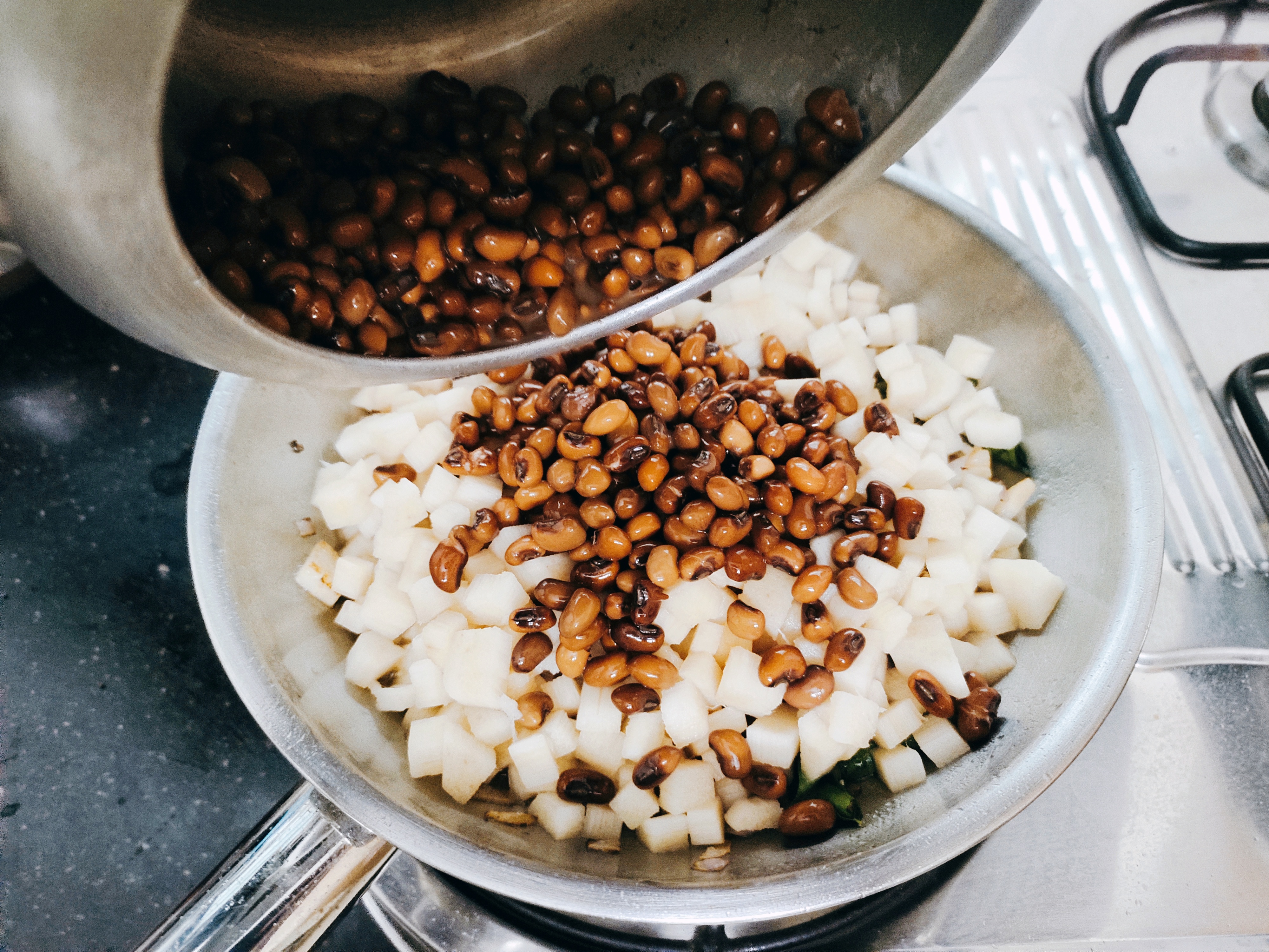 Now strain the banana stem and add them. Next comes the cooked cowpeas with the water in it.