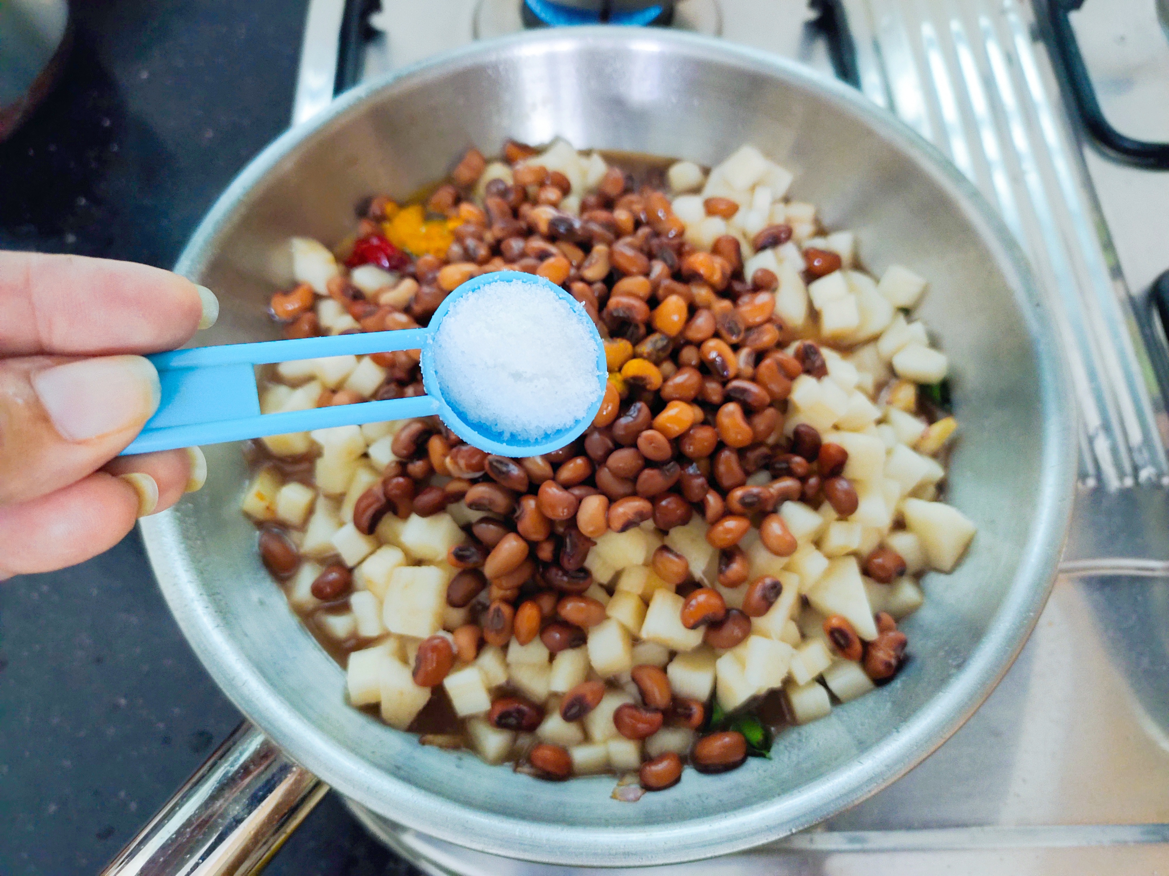 Add enough salt and close the lid. Donot add excess water. In simmer, let banana stem cook in the cowpeas water.