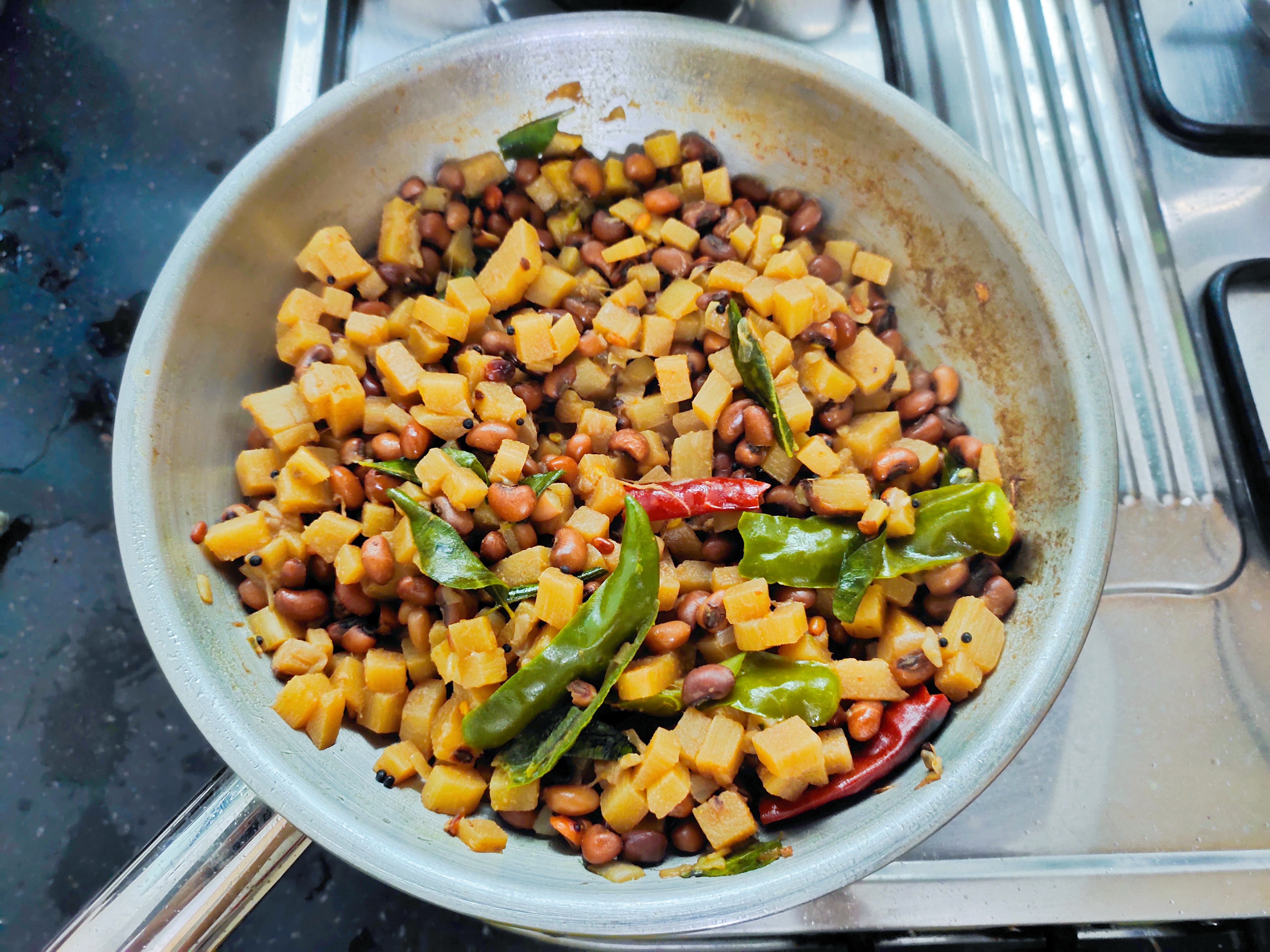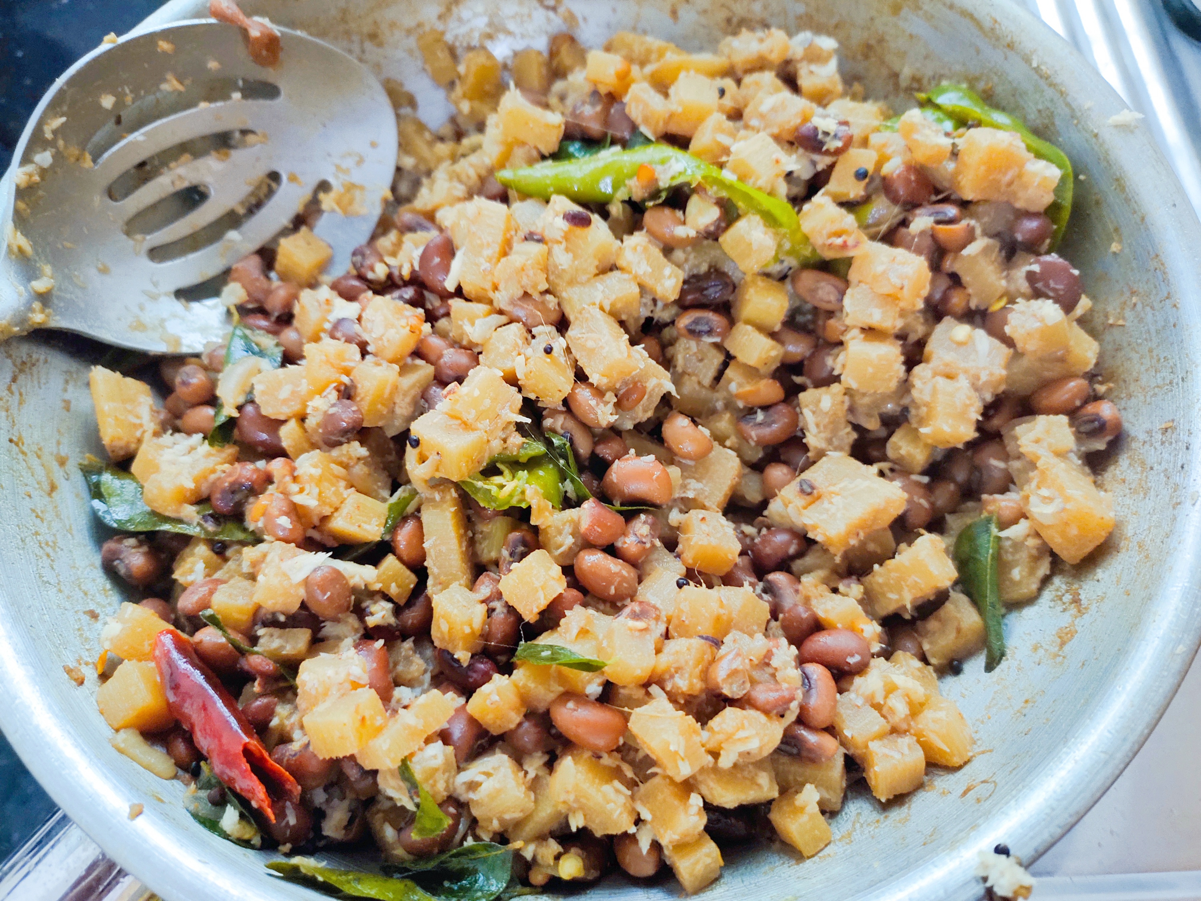 Serve the banana stem cowpeas stir-fry with rice and sambar for lunch.