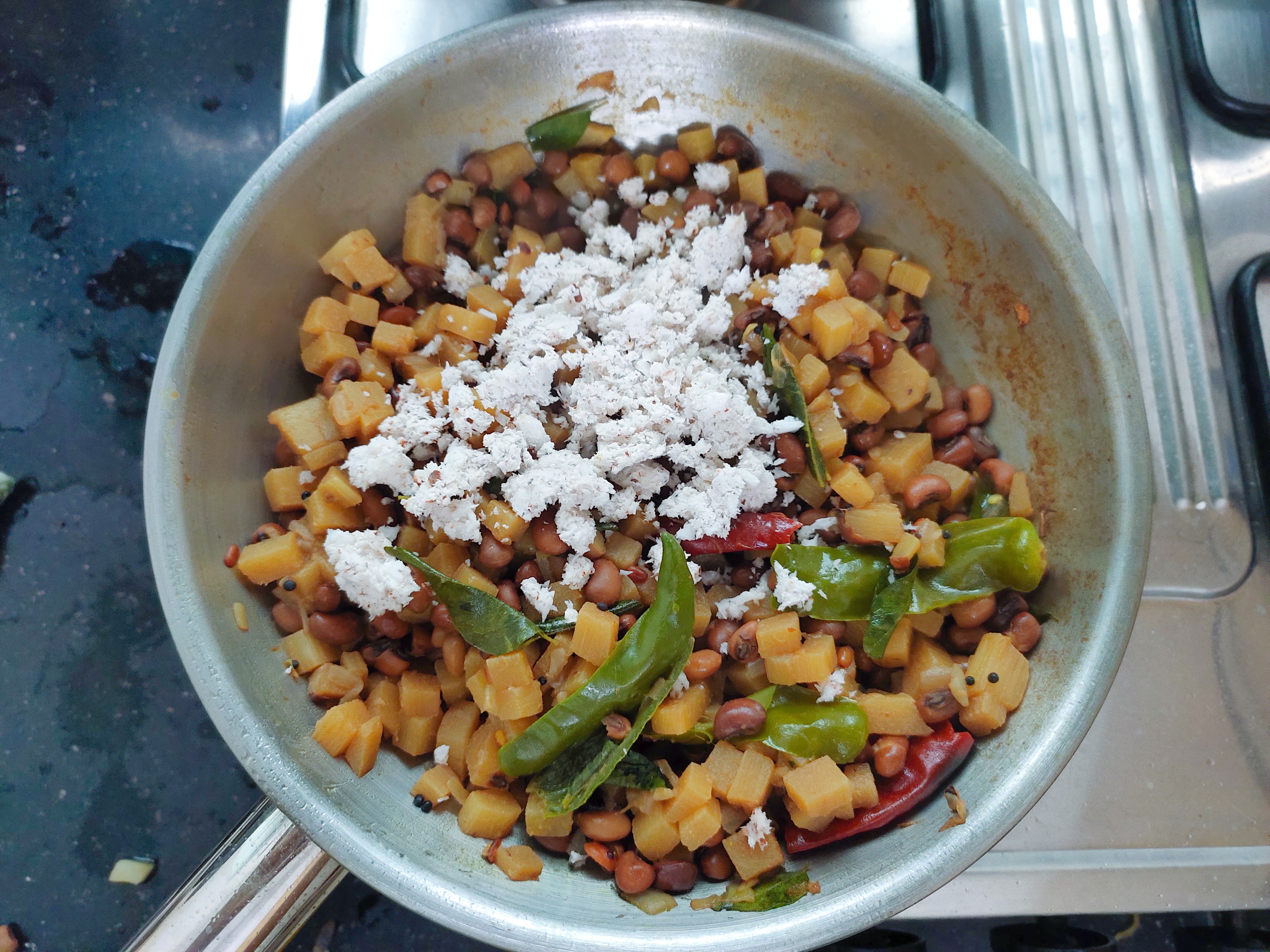 When the stem is cooked and water is fully evaporated, finally add 3tsp coconut scrapping and mix well .