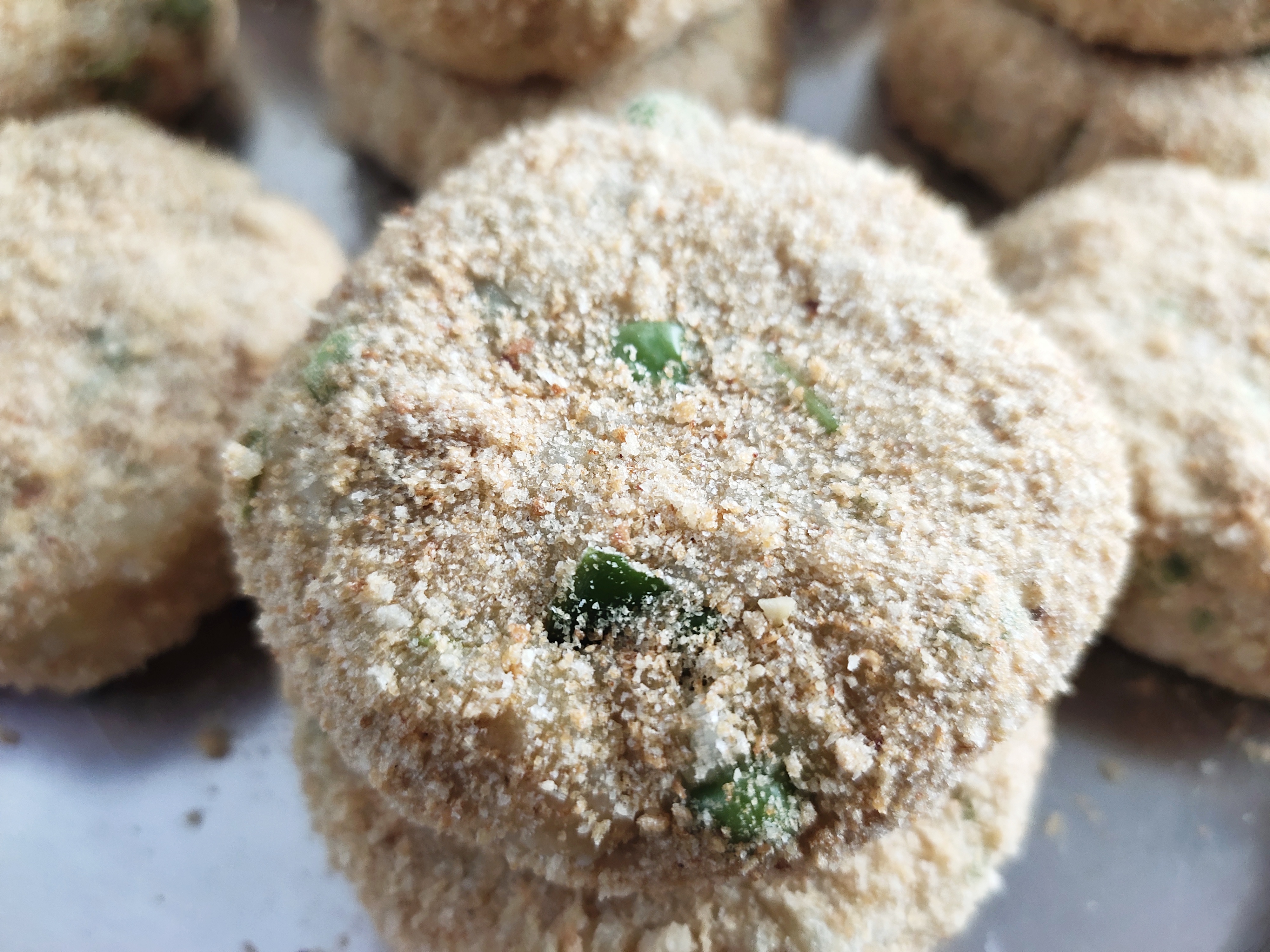 Make small balls, flatten them and coat with bread crumbs. Refrigerate them for an hour.