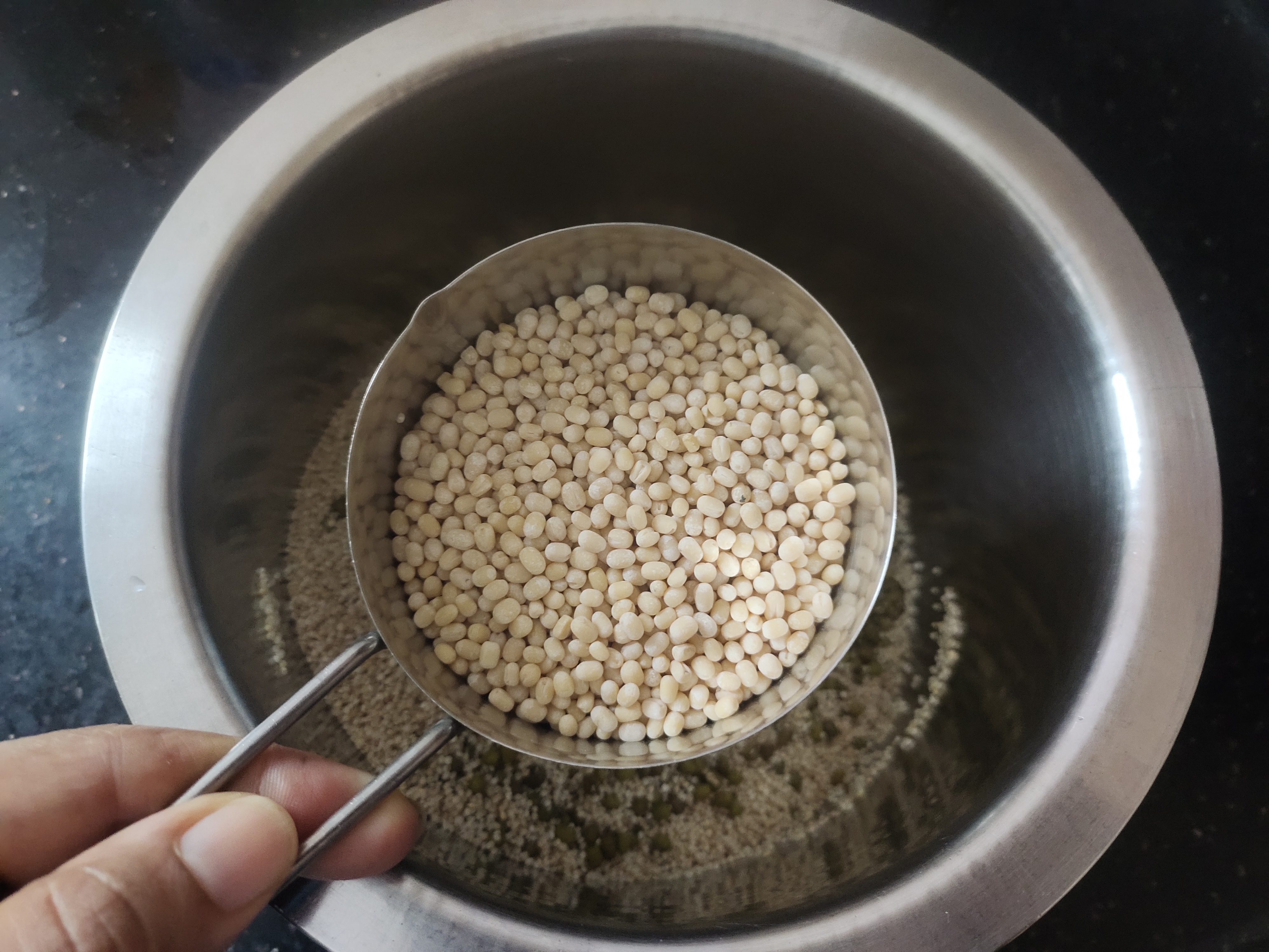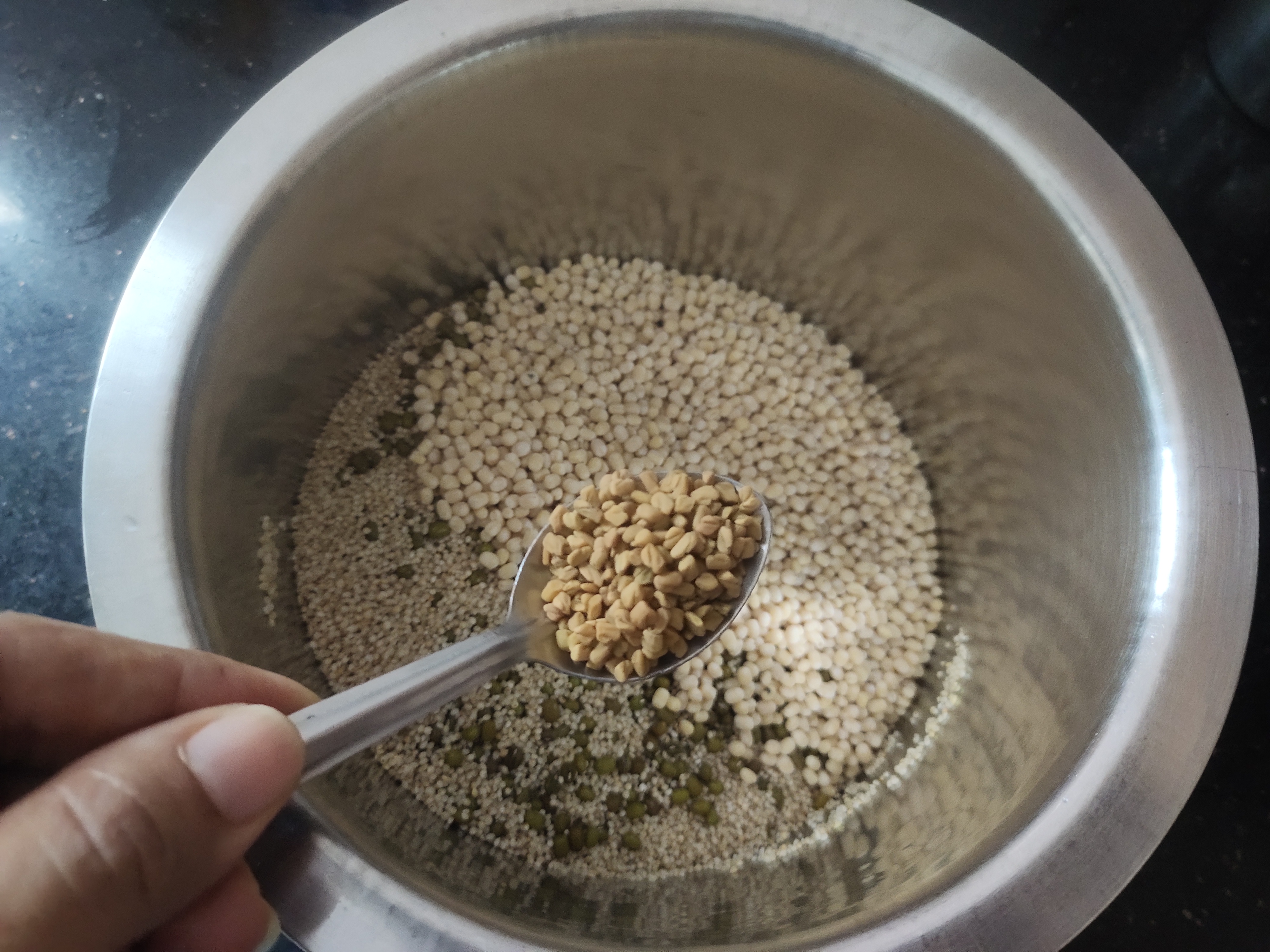 In a bowl take 1 cup millets, 1.5 cup green moong, 1/2 cup urad dal and 1/2 tsp methi seeds.