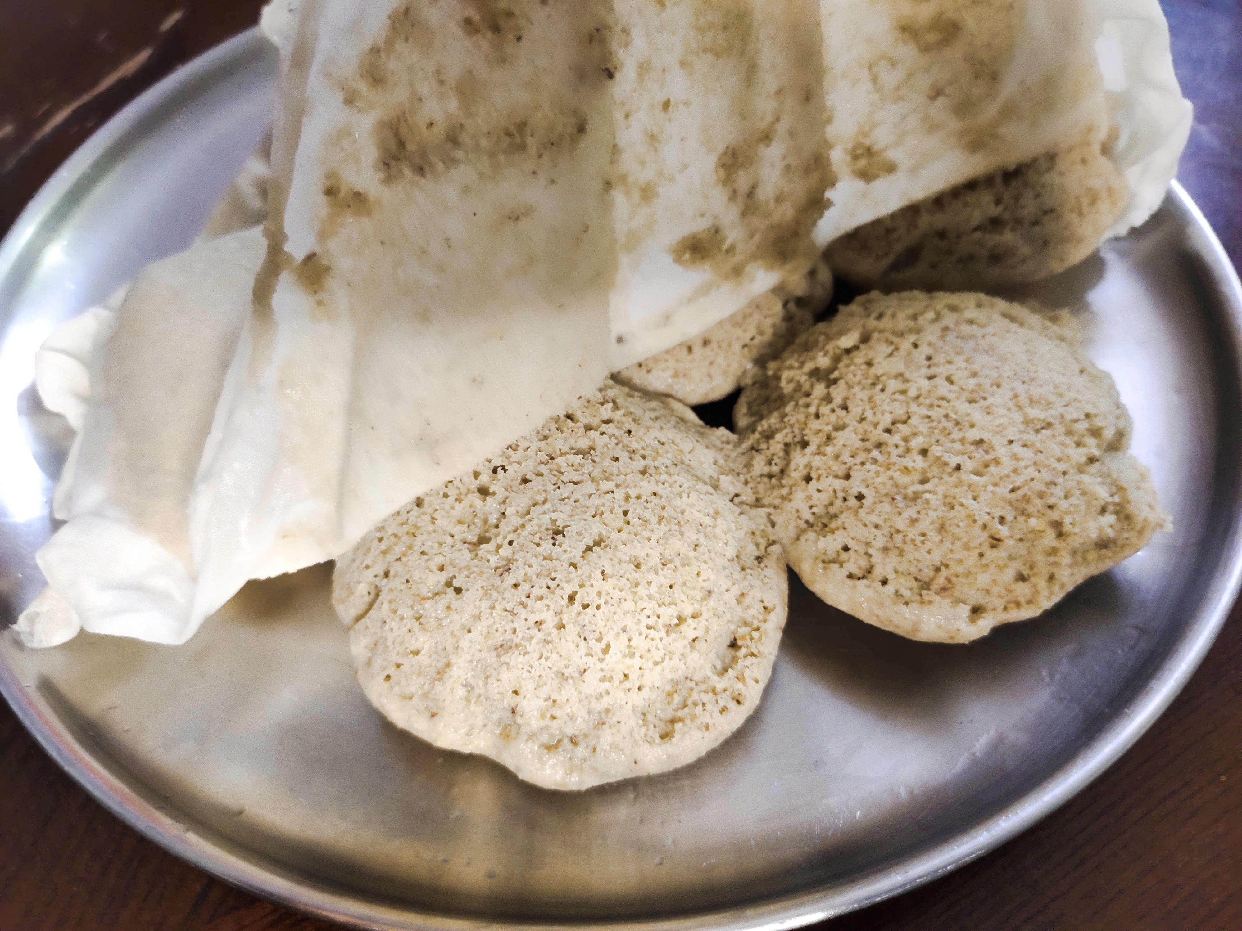 When it is cooked, sprinkle water on the cloth (around the idlis, to remove the idlis easily without sticking to cloth)