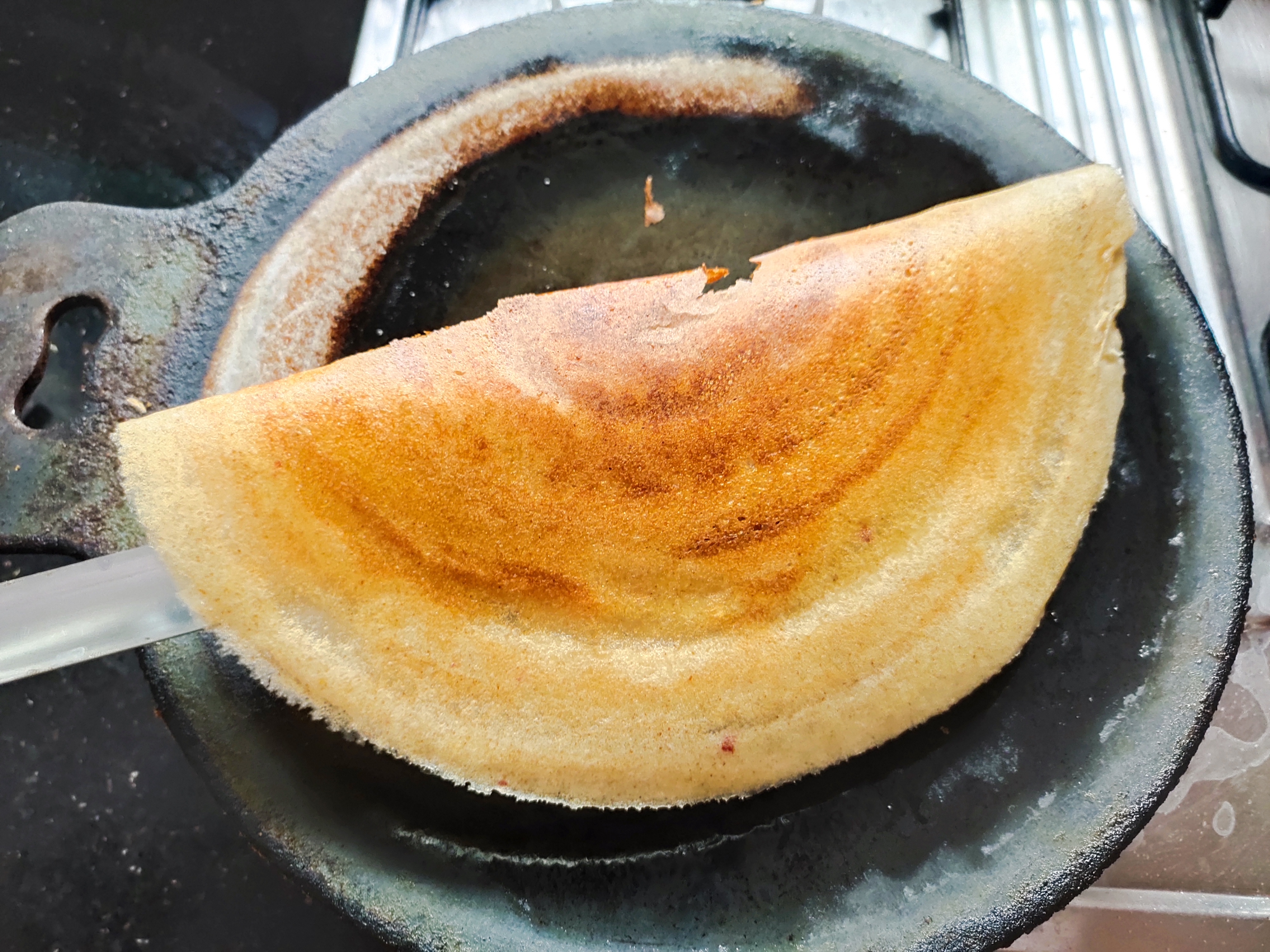 When it is golden & crispy, take the dosa with spatula by folding it.