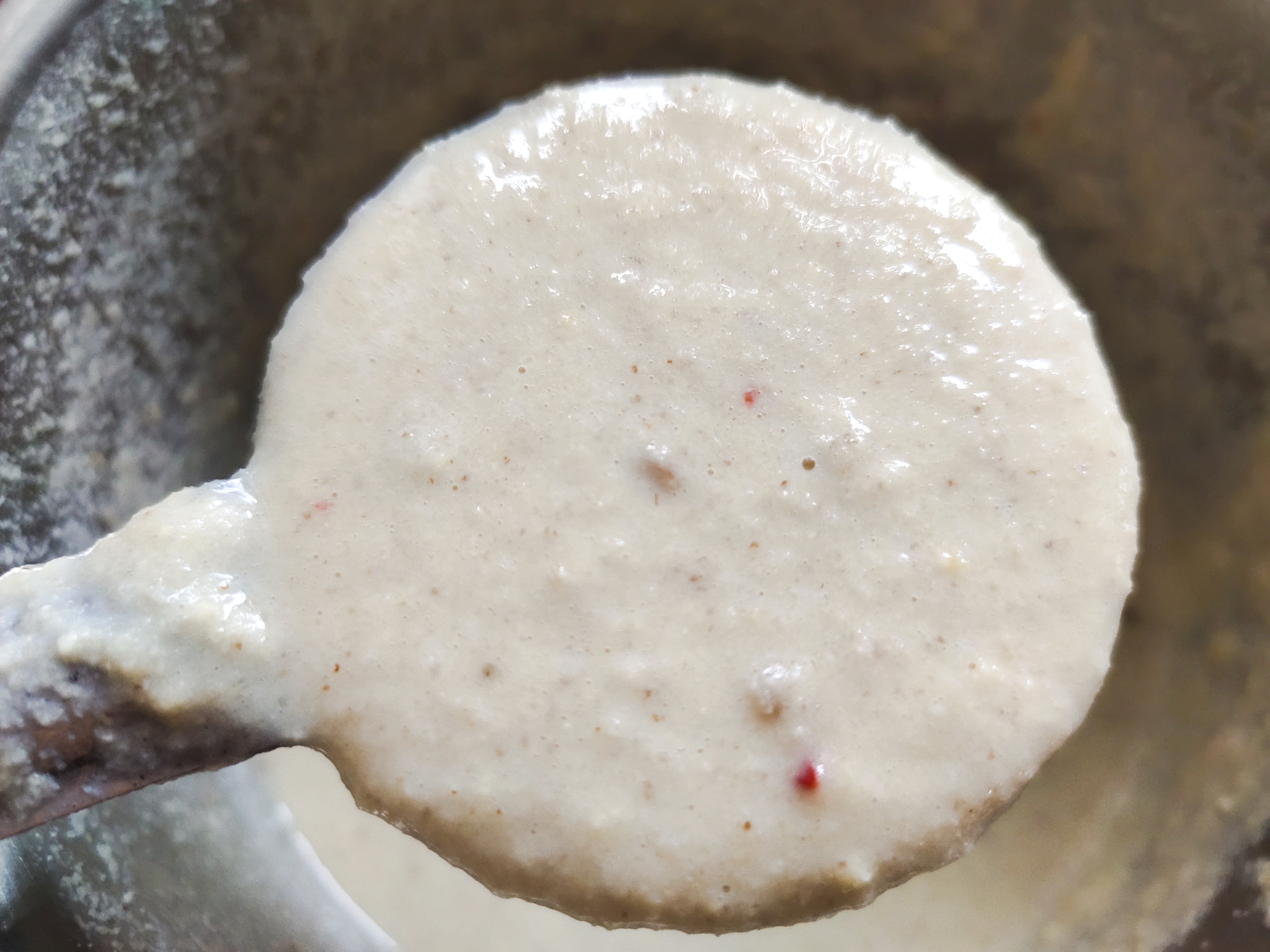 After 4 hours, drain the water and grind the soaked millets and lentils in a mixer jar by adding water little by little.
